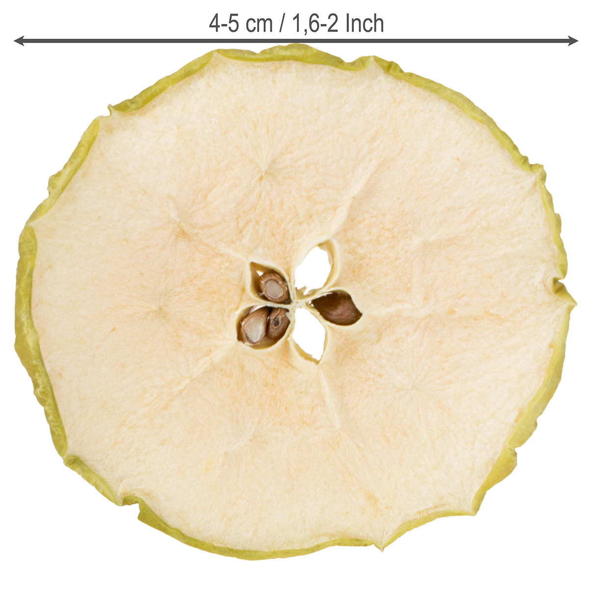 In each 500 gram package are several red apple slices to decorate, all of which are naturally slightly different sizes. Thus, the discs have a diameter of about 4 to 5 centimeters and are a decoration on the table runner at the dining table an extraordinary effect that is second to none.