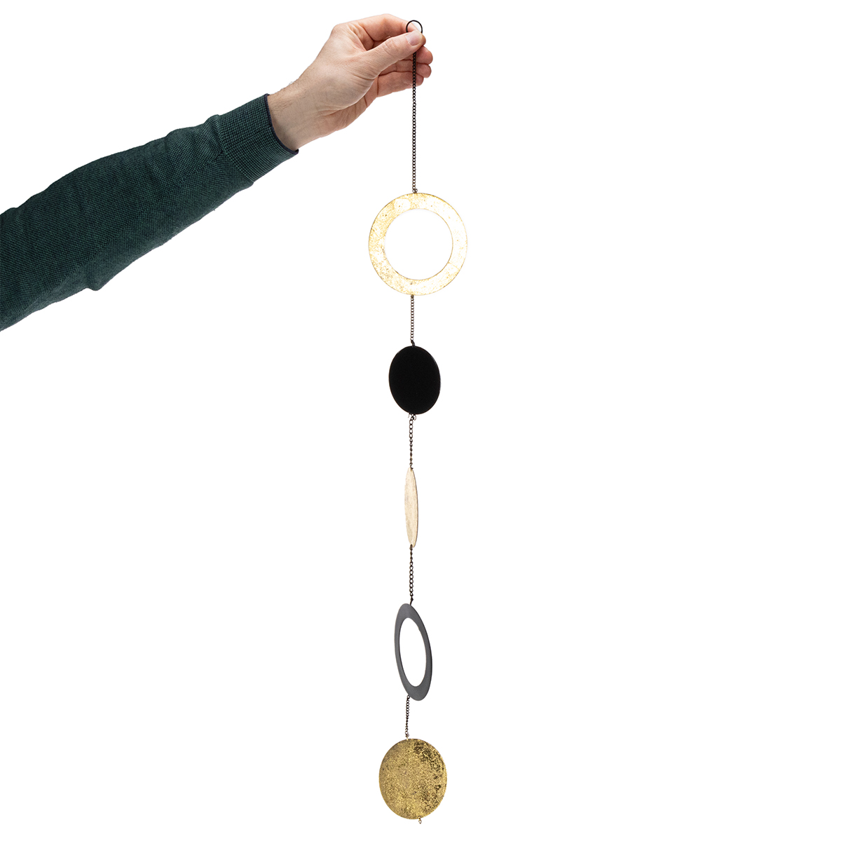 This decoration features five round elements in varying sizes, designed as discs and rings, alternating in black and gold. The circular hanging decorations are connected by thin metal chains and each has a small ring at the top for hanging.