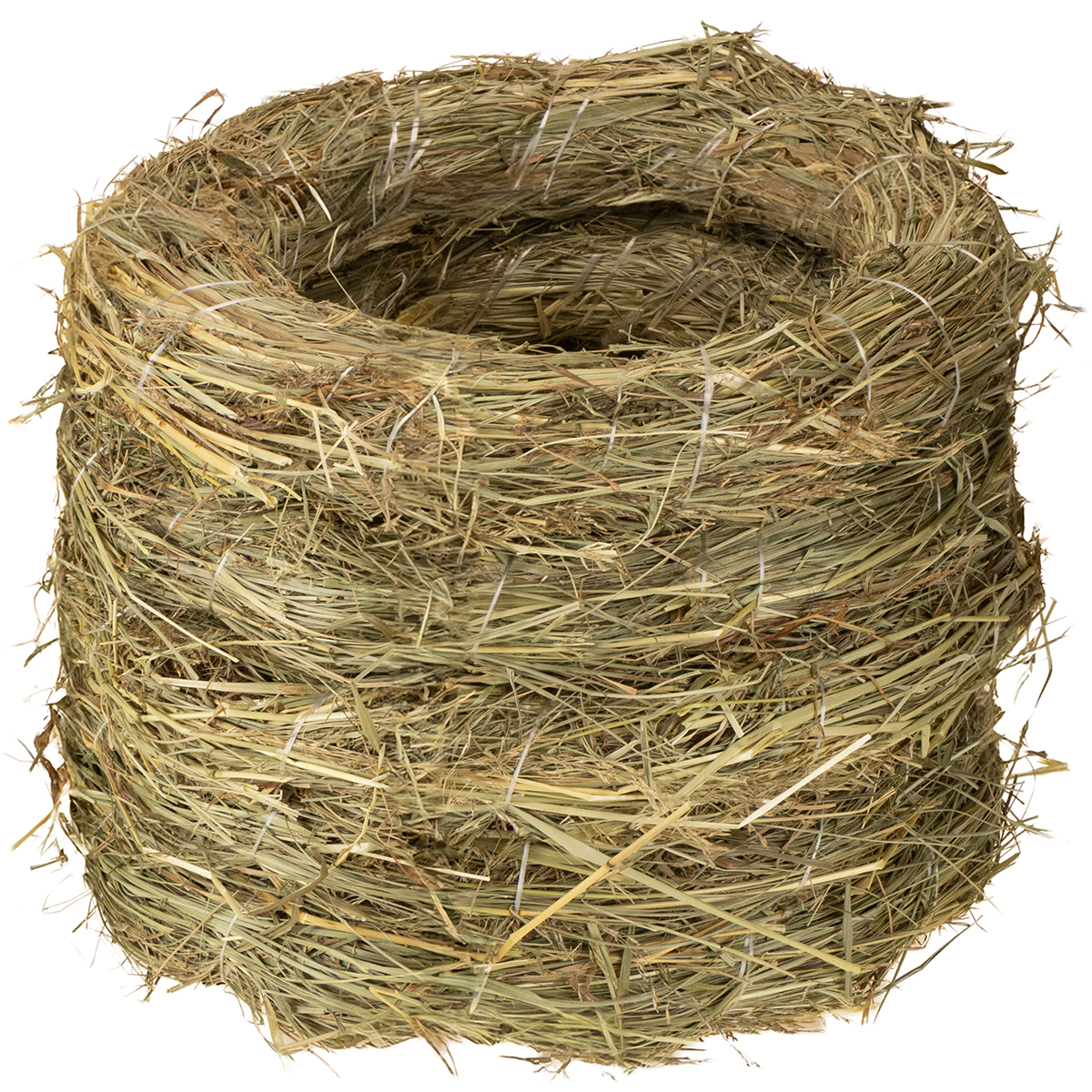 The hay wreaths are tied together in a package of 5 pieces and are all made by hand. High-quality hay was selected for this, which is then rolled into a ring and then tied into shape with a nylon cord. This is why the dimensions can always vary slightly; the wreaths have an outer diameter of approximately 26 to 27 centimeters. The inner diameter is approximately 19 centimeters and the height is around 4 centimeters.