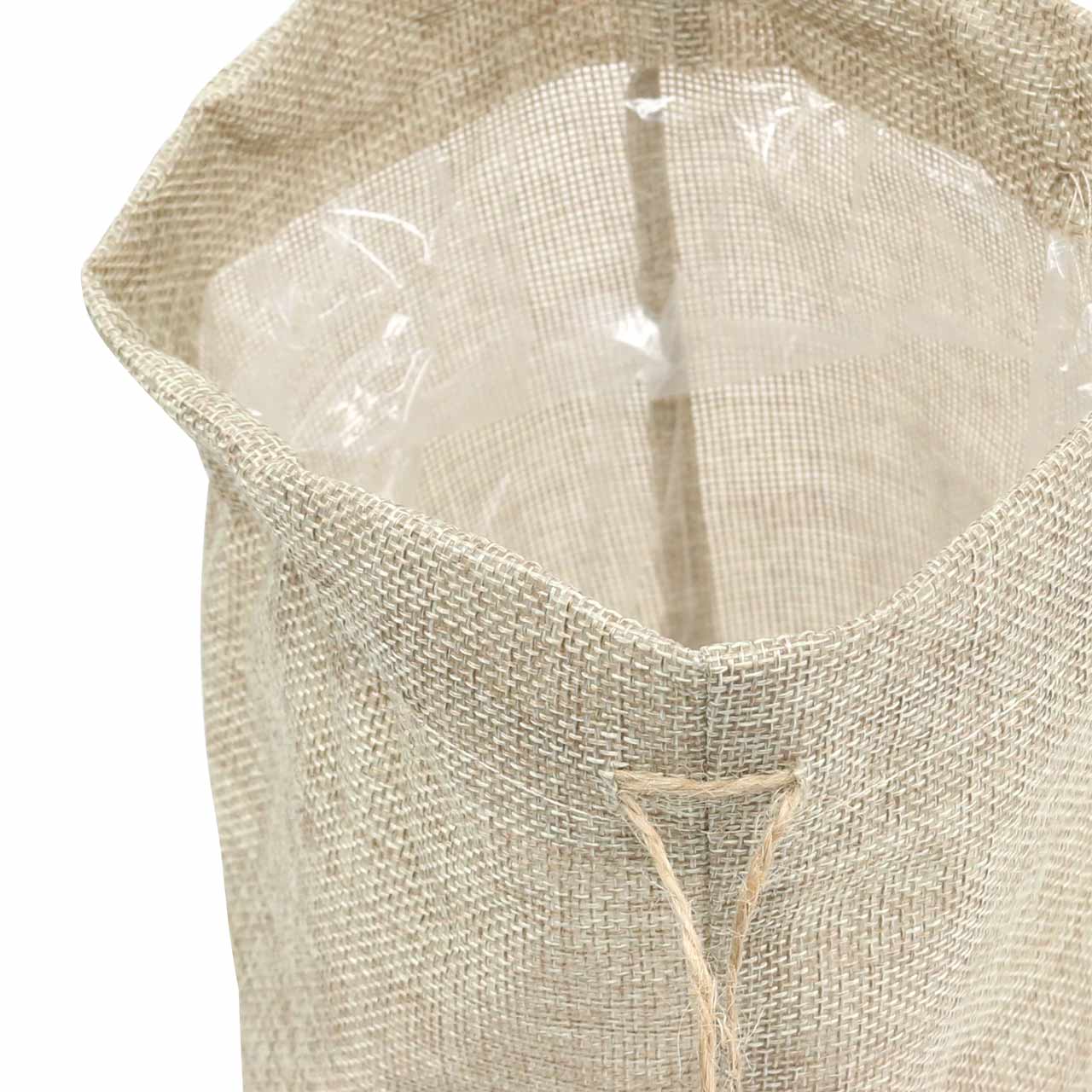 The jute bag is finely woven, placed on a tear-resistant layer of very thin plastic and provided with a cord in natural colors. The inside of the bag is also lined with robust plastic film, so that it is also suitable for flower gifts or even as a planter.
