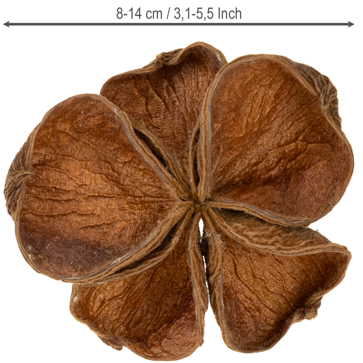 The Landlotus in its natural color is packed in a bag for a total of 50 fruit groups. The star-shaped groups have different diameters of about 8 to about 14 centimeters, while the individual fruit capsules can be between 3 and 7 centimeters in size. Since this is a natural product, the sizes may differ from the specified dimensions.