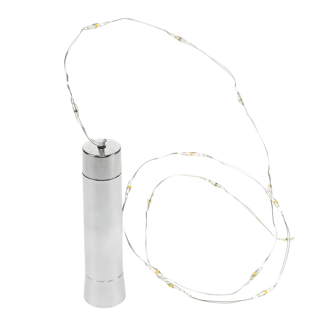 The LED bottle light in warm white has a total length of approximately 82 centimeters with the cap. A total of 15 small LEDs sit on the approximately 73 centimeter long chain of lights. The silver cap has a diameter of about 2 centimeters at the top and tapers slightly towards the bottom so that it fits into the neck of a wine bottle, for example. You also need an AA battery for the bottle lights.