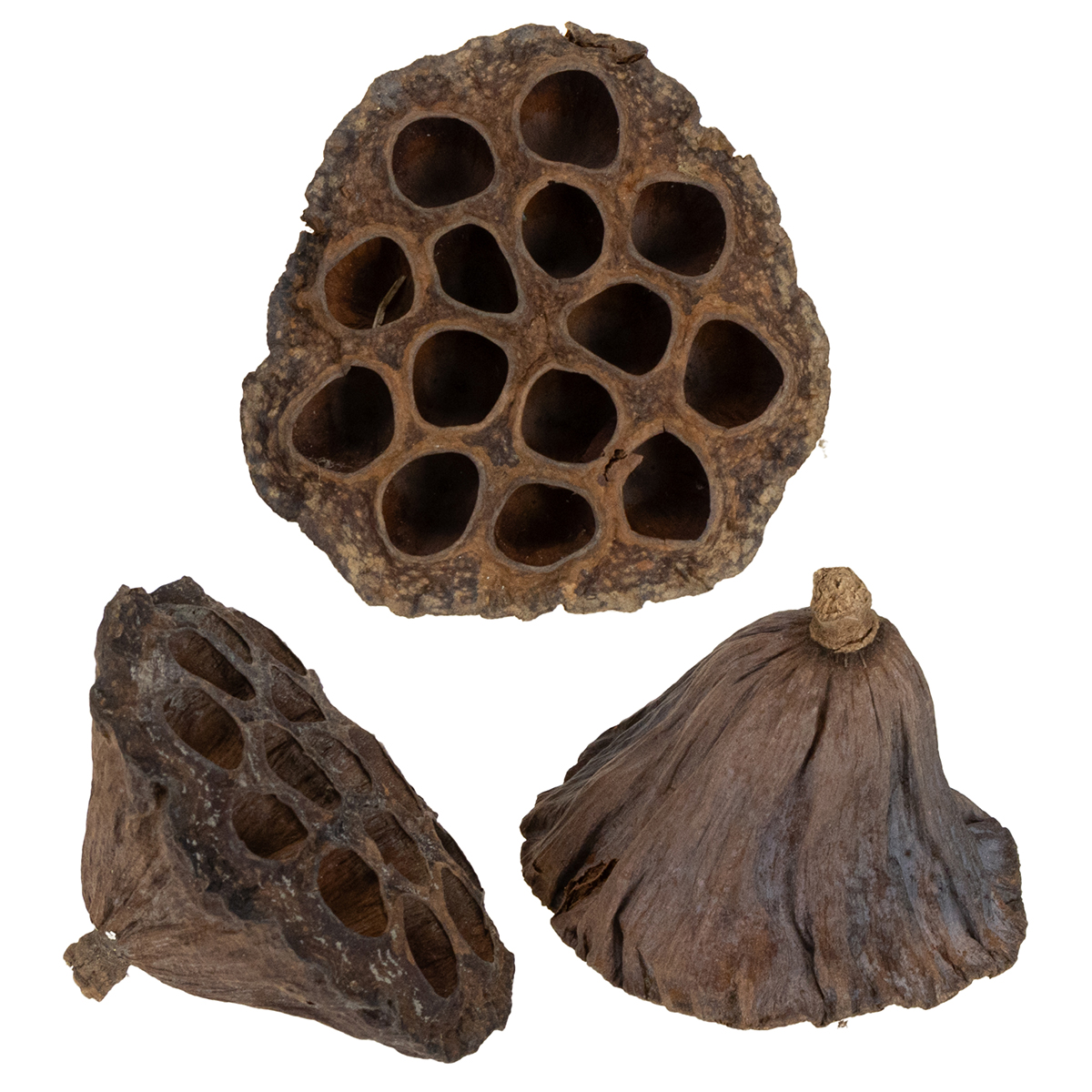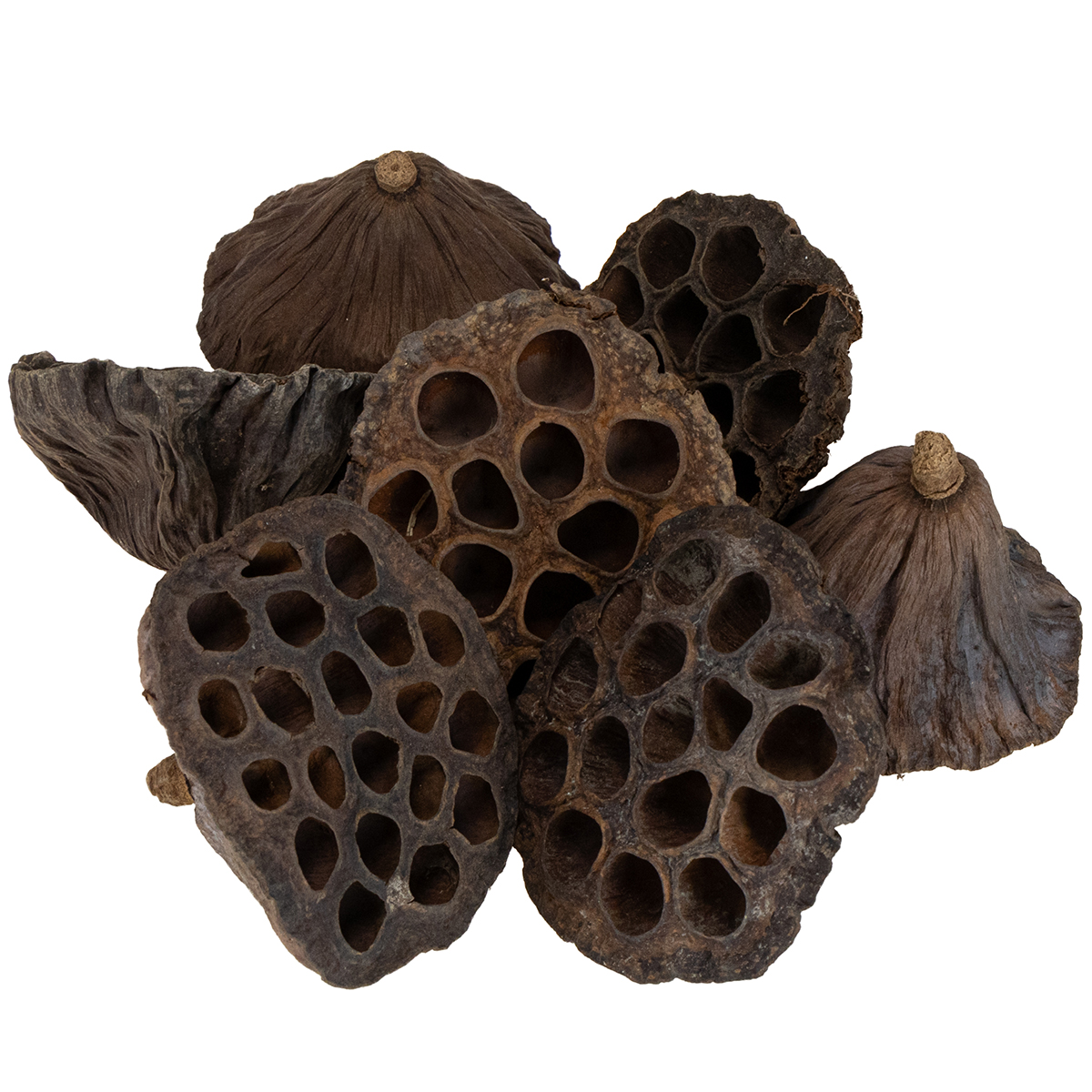 The lotus piston in its natural color is 100 pieces in a large bag and can vary as a natural product of the specified dimensions. Thus, the lignified lotus pistons may have a size of about 4.5 to 6.5 centimeters and have a diameter between 6 and 9 centimeters.