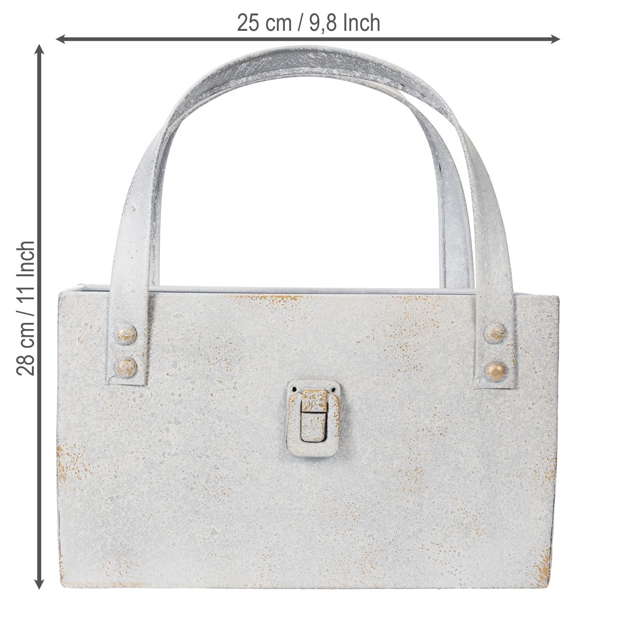 This metal bag combines modern design with timeless, rustic charm. The sturdy handle not only makes it easy to carry but also a real eye-catcher. The slightly aged, vintage-style finish adds a particularly stylish touch and blends beautifully with a variety of interior design styles, from country to industrial. Want to use this decorative metal bag as a planter? No problem! It's ideal for stylishly displaying small flower arrangements or succulents. Seasonal accents, such as autumn decorations with pumpkins or a Christmas arrangement filled with fir branches, also look fantastic in this bag. Equally practical: Use the bag as an organizer for gardening tools like scissors or gloves. This keeps everything within easy reach and looking attractive. The neutral, matte gray color complements almost any setting and harmonizes wonderfully with other decorative elements. For example, combine the metal bag with our simple glass vases or rustic wooden bowls from Floristik24 to create even more harmony in your decor. A true all-rounder!