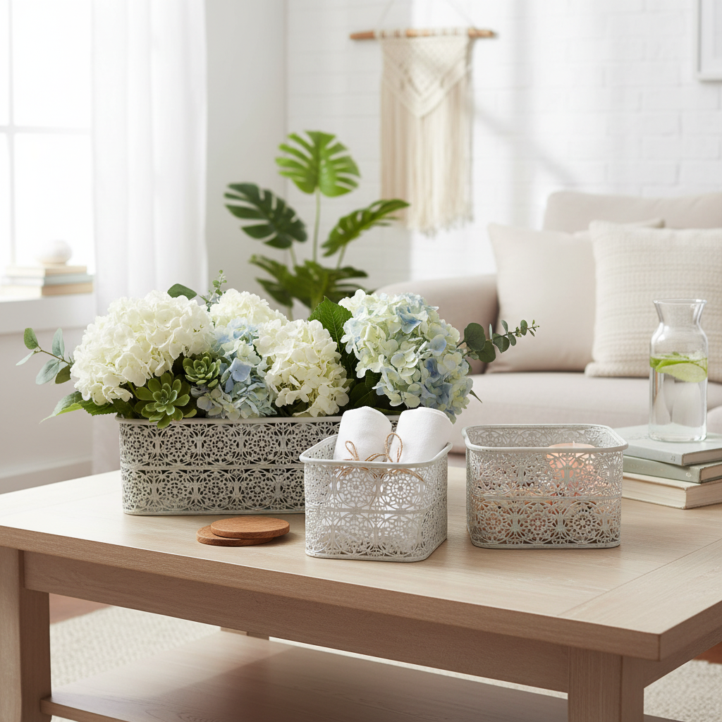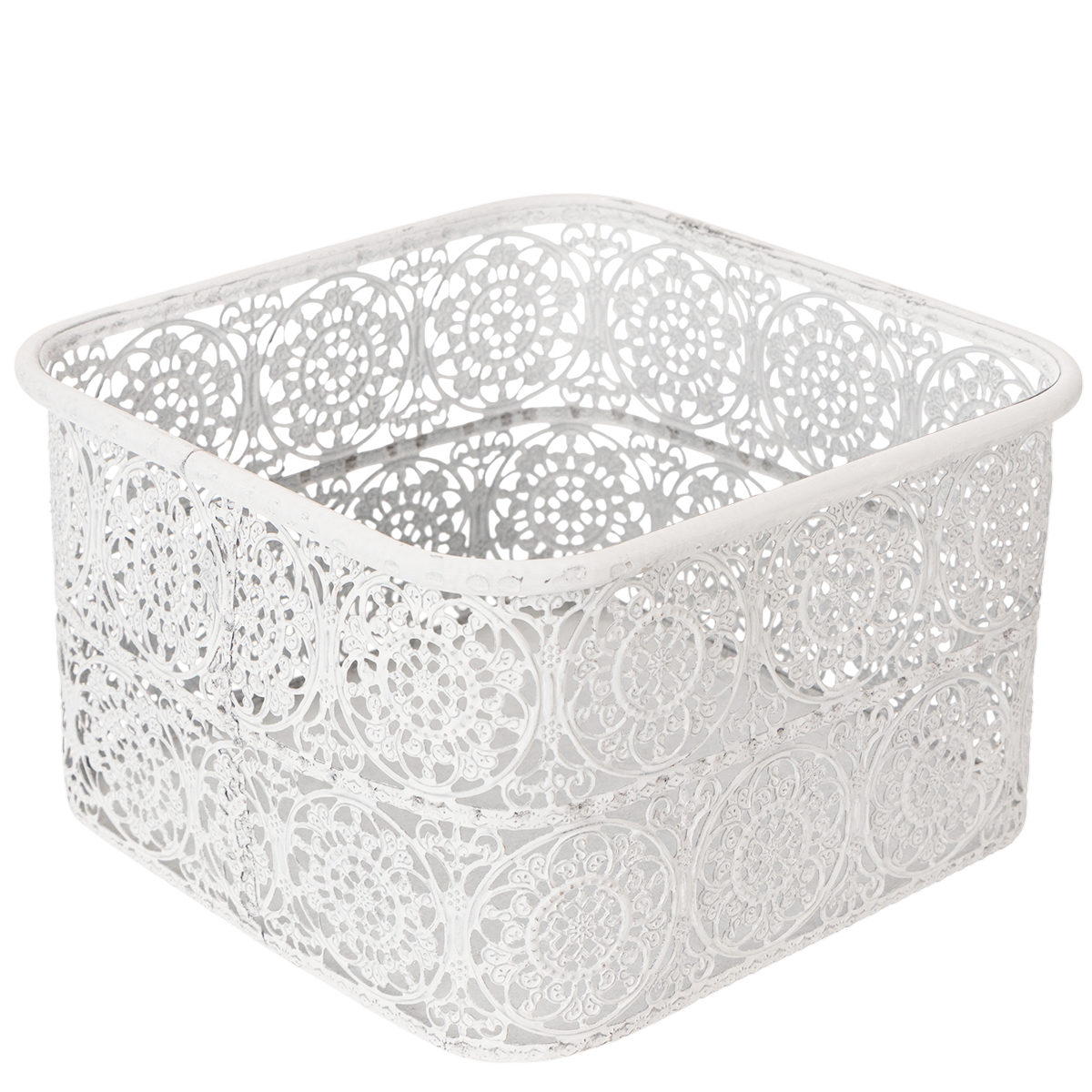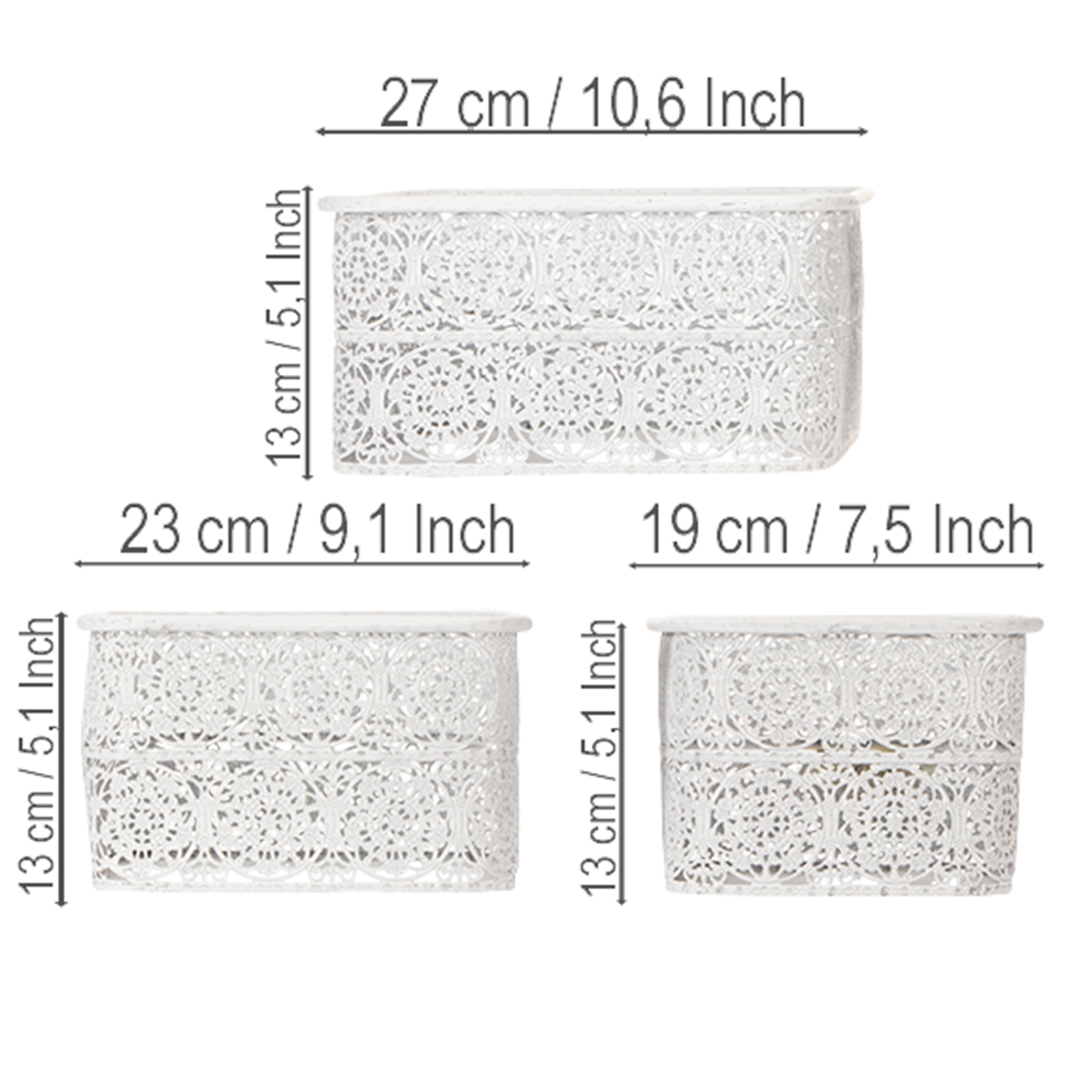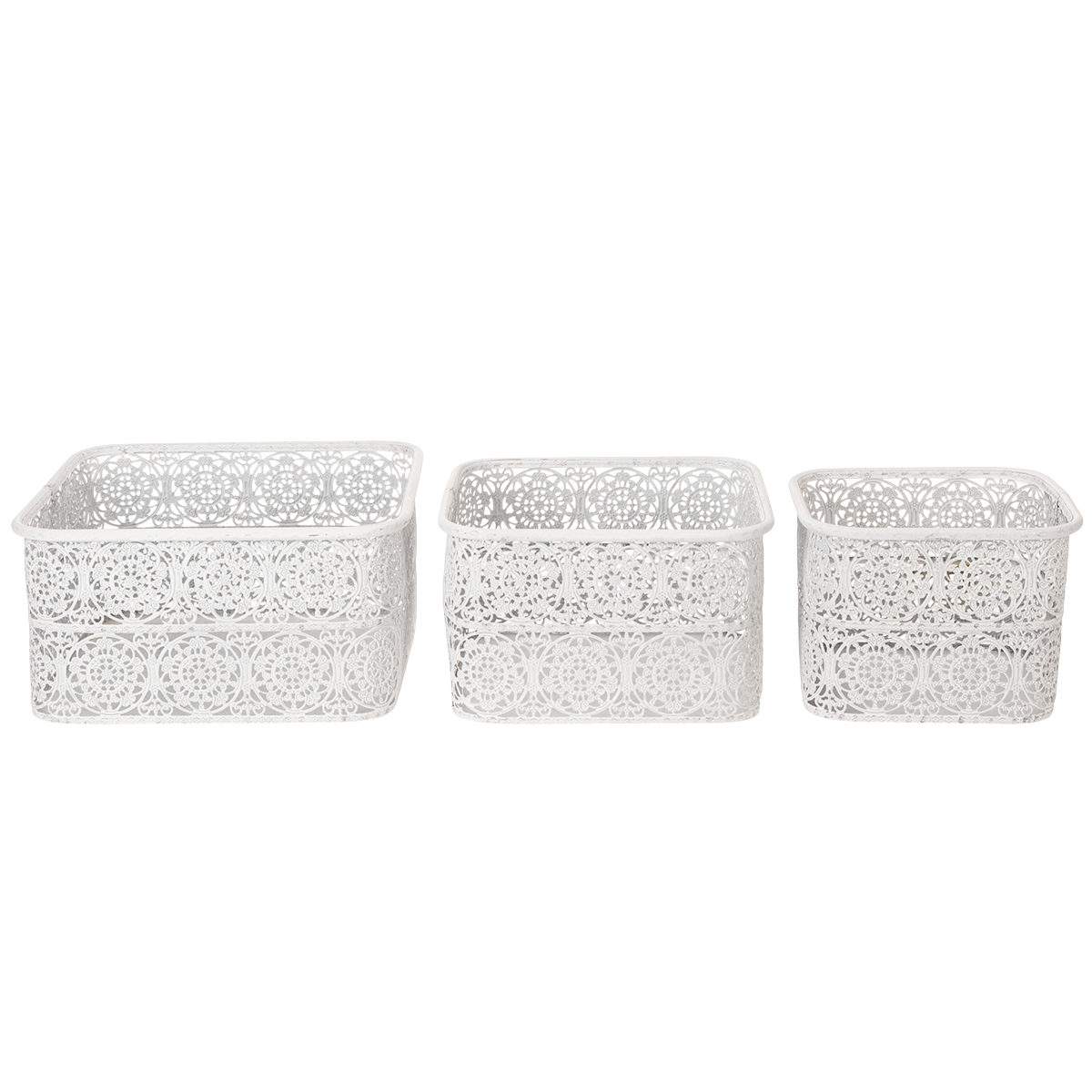 Metal bowls with lace pattern, decorative container, square, shabby chic, white, 27/23/19cm, H13.5cm, set of 3