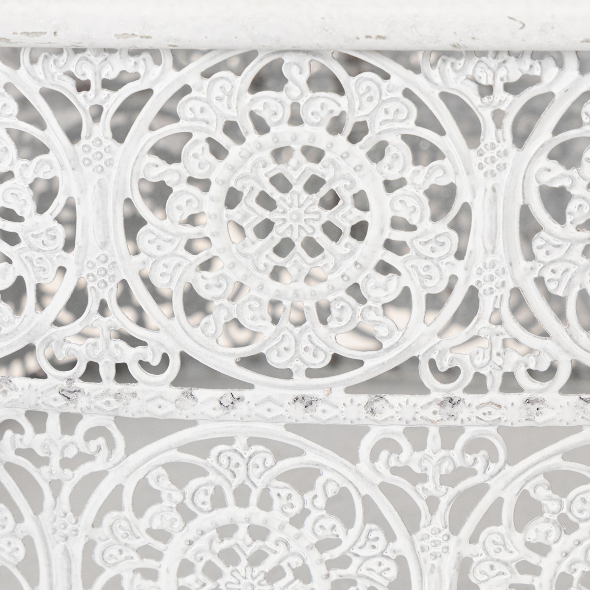 These metal bowls with a lace pattern come in a practical set of 3 in different sizes. The angular decorative vessels are designed in trendy shabby chic, so that the silver of the metal shines through in places through the white paint.