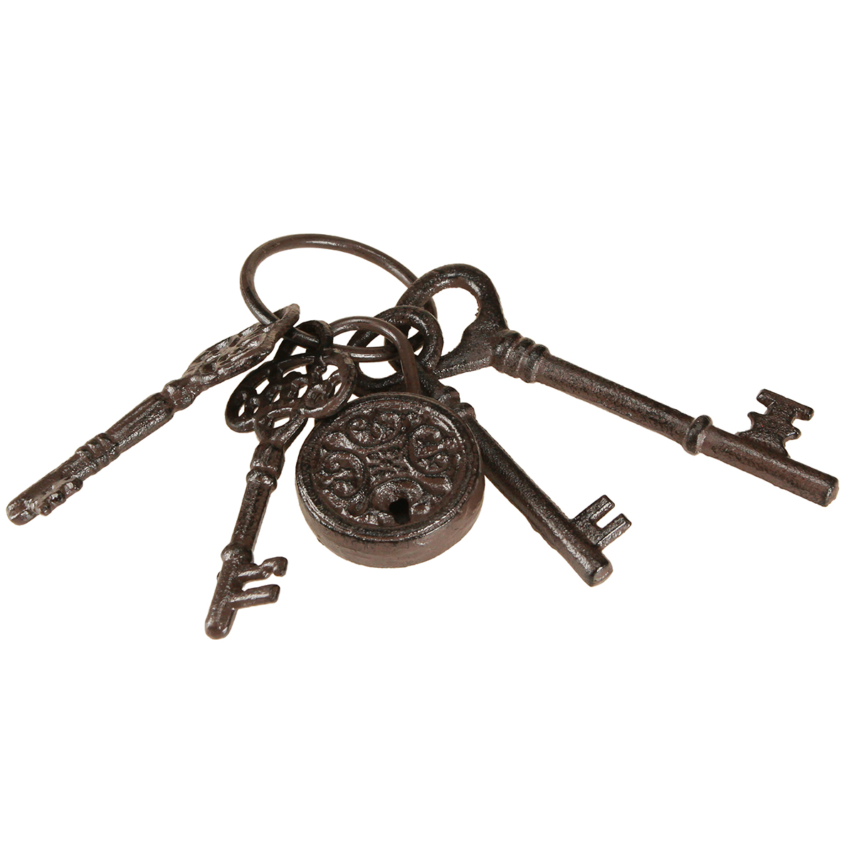 Refine your vintage decoration with this original bunch of keys on a metal ring in brown! The individual keys and the ring in this hanging or table decoration are made of cast iron. The individual elements are painted in a dark brown, which also creates the non-slip patina on the surface. This makes the decorative keys and the lock appear artificially aged, which is further underlined by the vintage design of the individual beards.