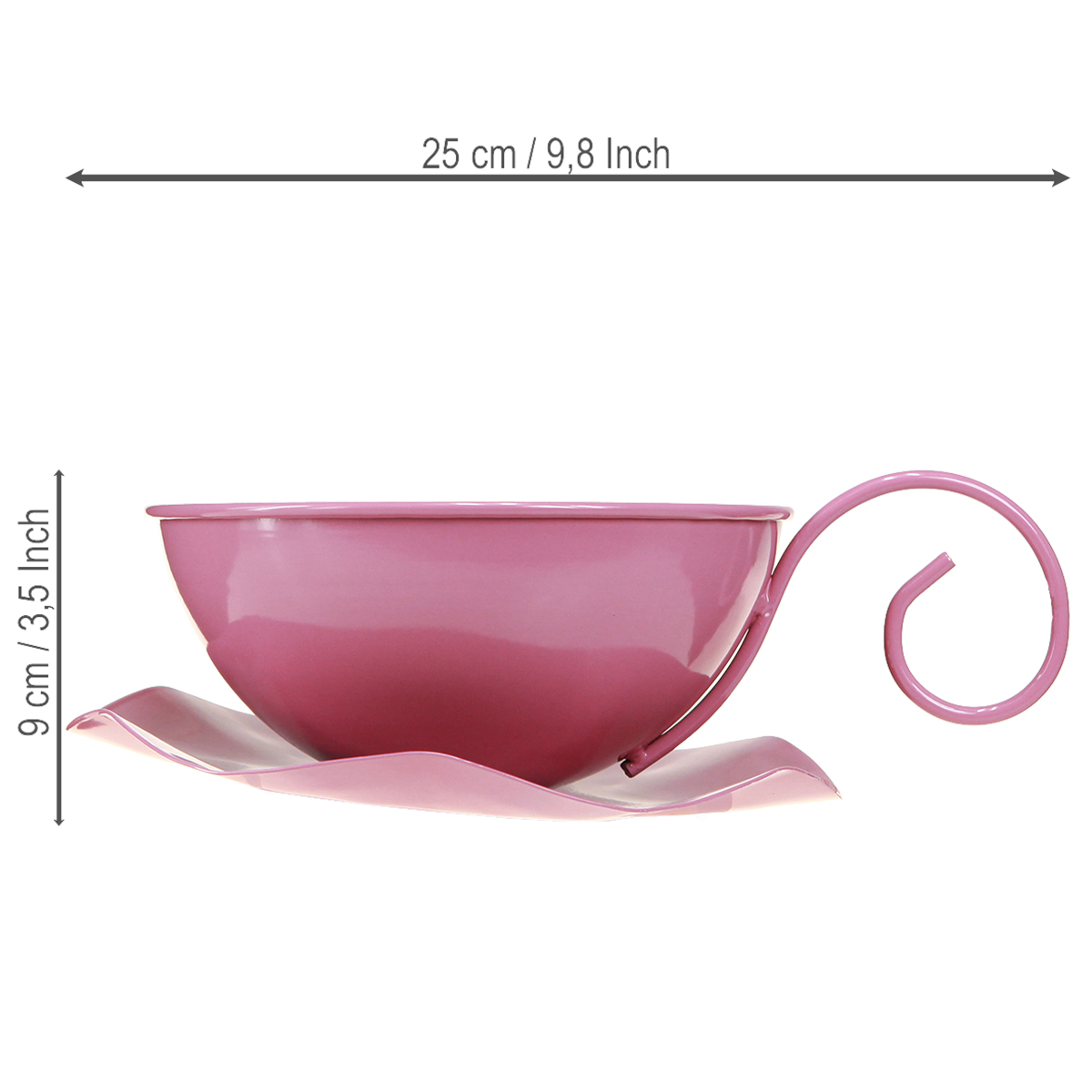 Our decorative cup in pink is a real highlight for every home. With a diameter of around 16cm and a height of around 9cm, the metal cup is suitable for both decorative and functional applications. The surface, painted in a pastel pink, attracts everyone's attention and creates a cheerful, inviting atmosphere. The curved handle and the flower-shaped saucer give the cup a playful yet modern touch. Thanks to the cup being fixed to the saucer, this metal decoration is perfect for presentation on a festively set table or on the windowsill.