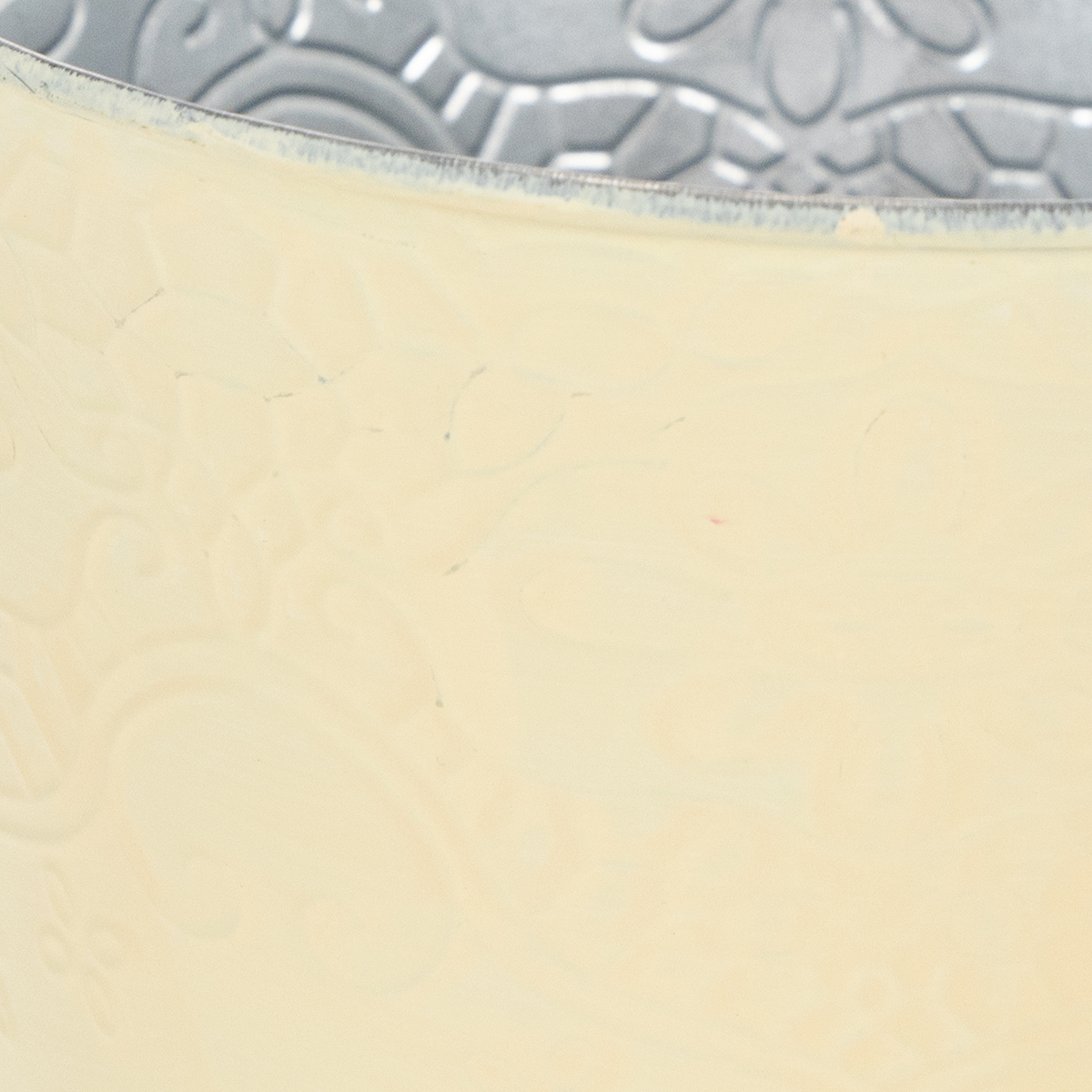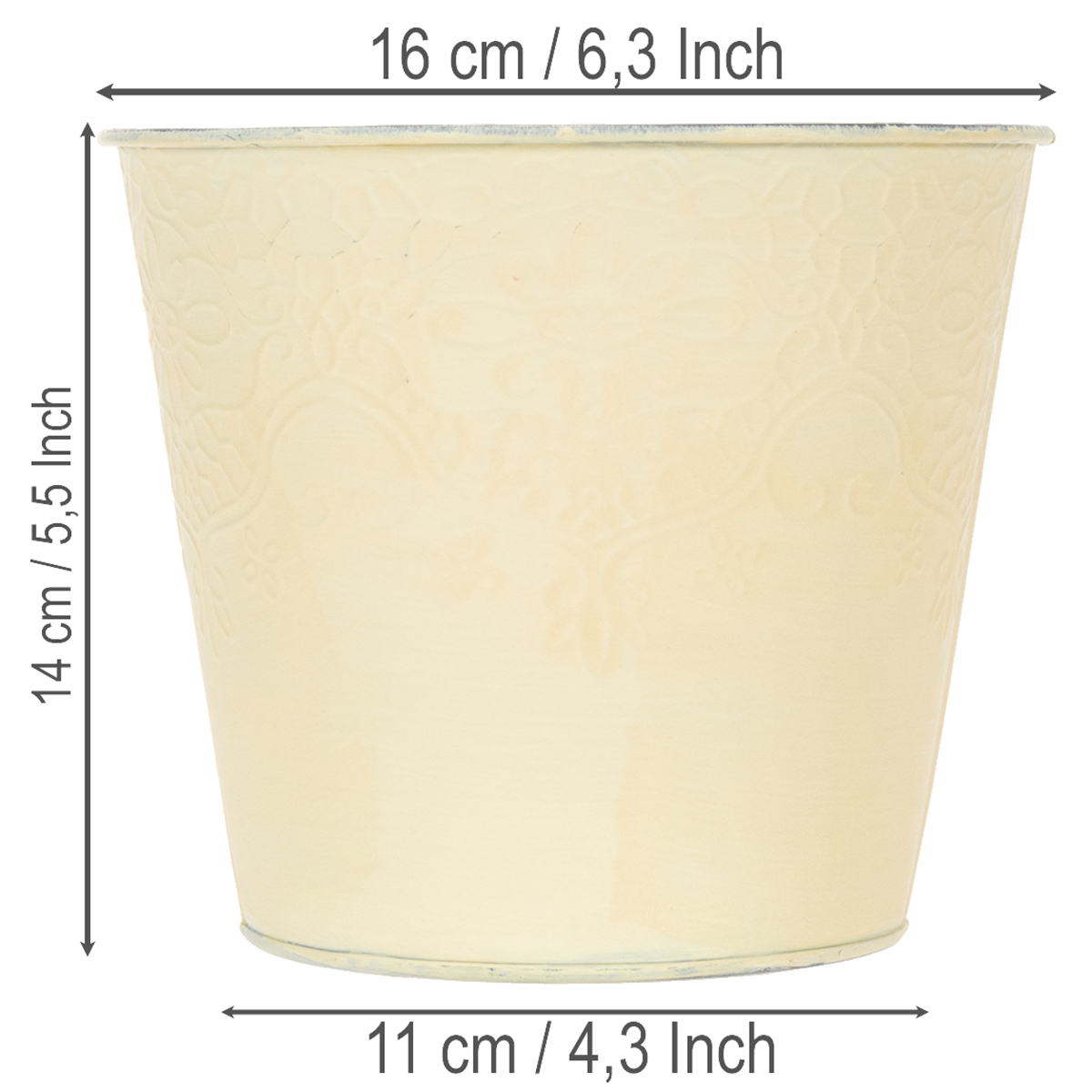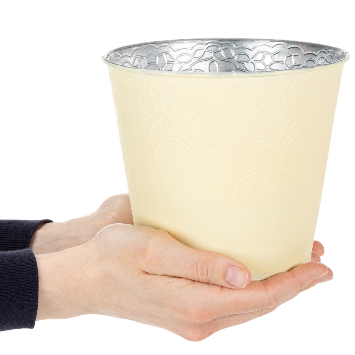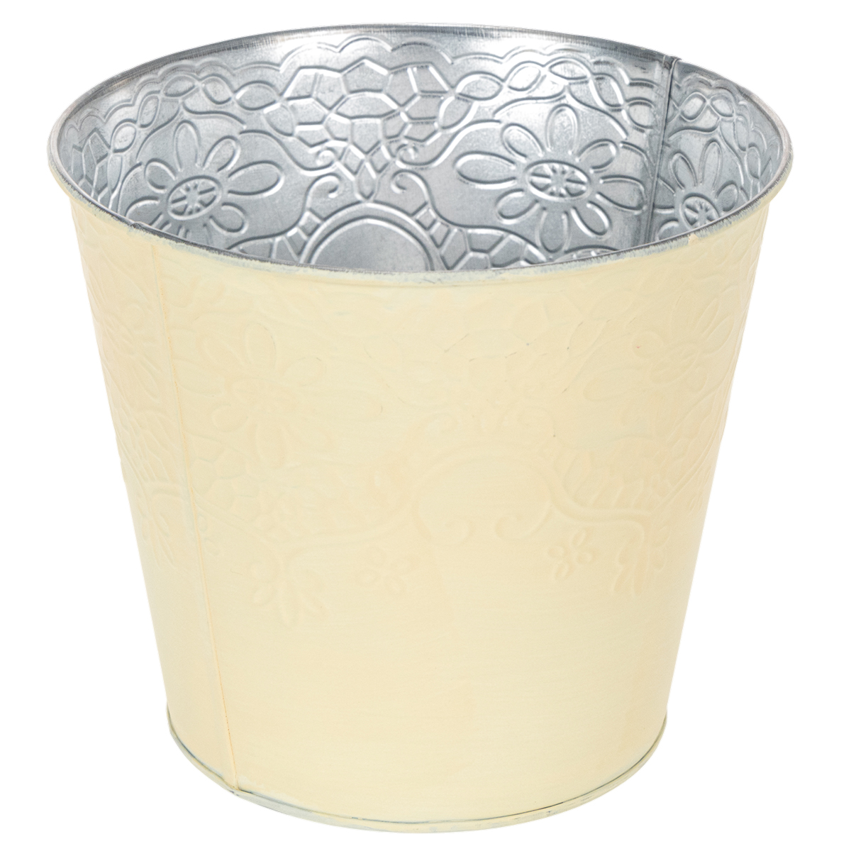 The high-quality metal decoration is decorated with an embossed floral pattern full of retro chic and painted in bright yellow on the outside with visible brush strokes. Flowers and tendrils on the flower pot are reminiscent of