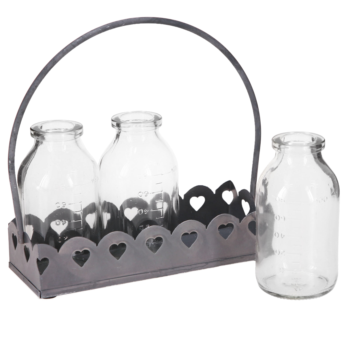 Experience the magical appeal of mini bottle decorations as vases on a tray. These charming decorative bottles are perfect for adding a touch of nostalgia to your living space. Each of the three glass vases is reminiscent of antique apothecary bottles and is placed on a sturdy, gray metal tray with punched-out heart motifs. This retro-style detail adds a romantic touch to the arrangement, making it ideal for wedding decor, cozy table settings, or as a gift idea. The dimensions of the bottles allow for a variety of uses, from quickly planting small floral arrangements to storing herbs or craft materials.