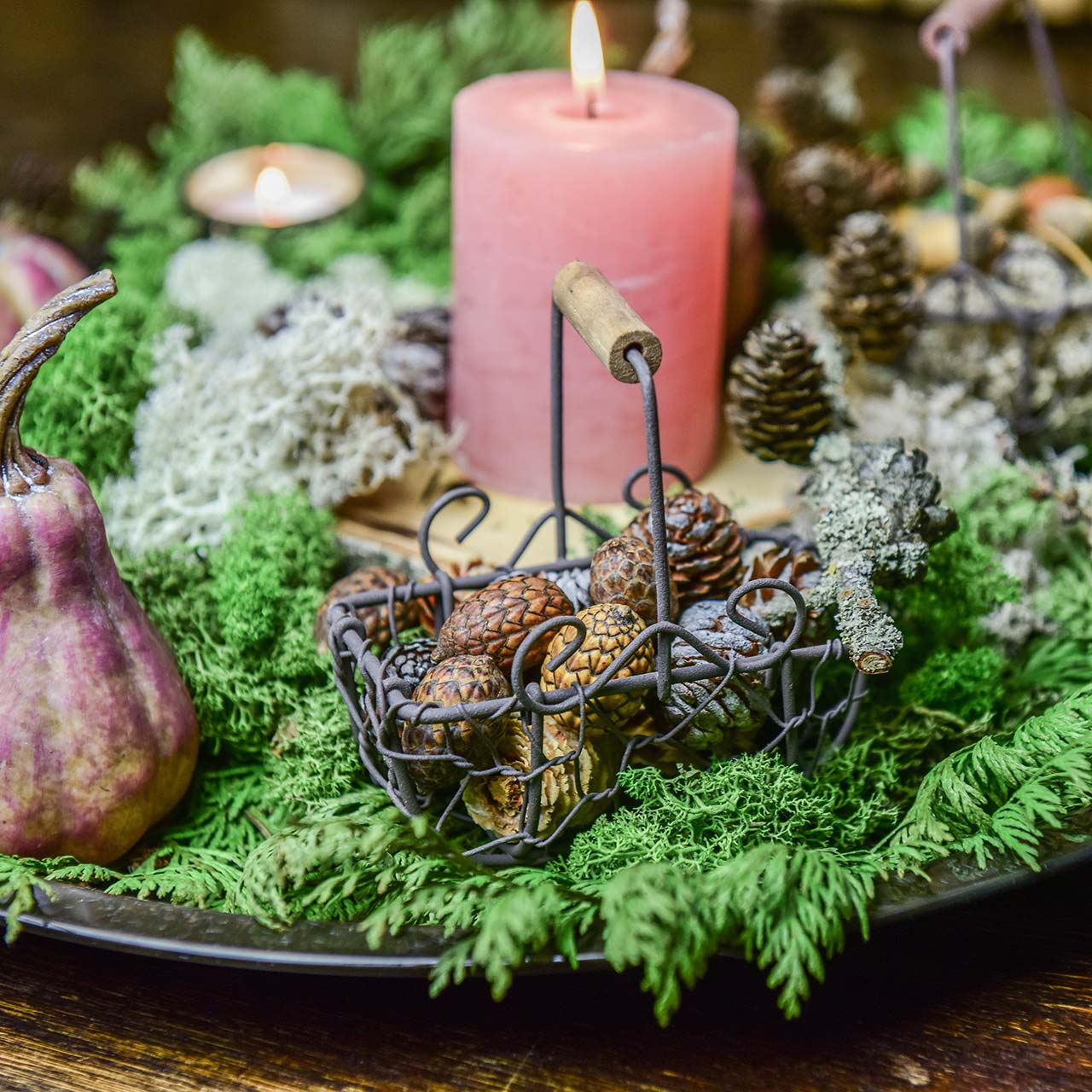 The small wire baskets in miniature size are designed as detailed as large metal baskets: the frame and reinforcement are made of solid metal and covered with sturdy metal wire mesh. The handle of the metal decorative basket goes upwards and has a wooden handle. A curved decorative metal ornament is attached to each side of the basket handle. - The set contains three basket shapes: a round handle basket, an oval and a rectangular model.