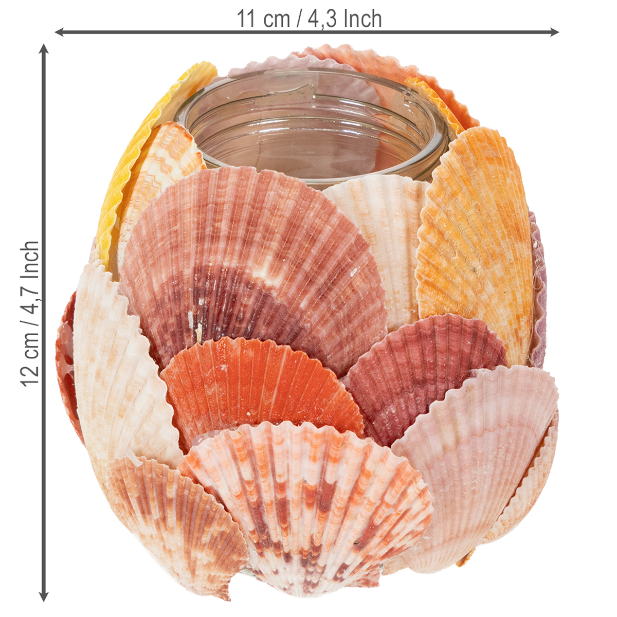 With a height of 12 centimeters, a diameter of 11 centimeters, and its handy shape, the tealight holder blends perfectly into various decorating styles. The natural colors of the shells harmonize particularly well with country-style or nautical-themed furniture.