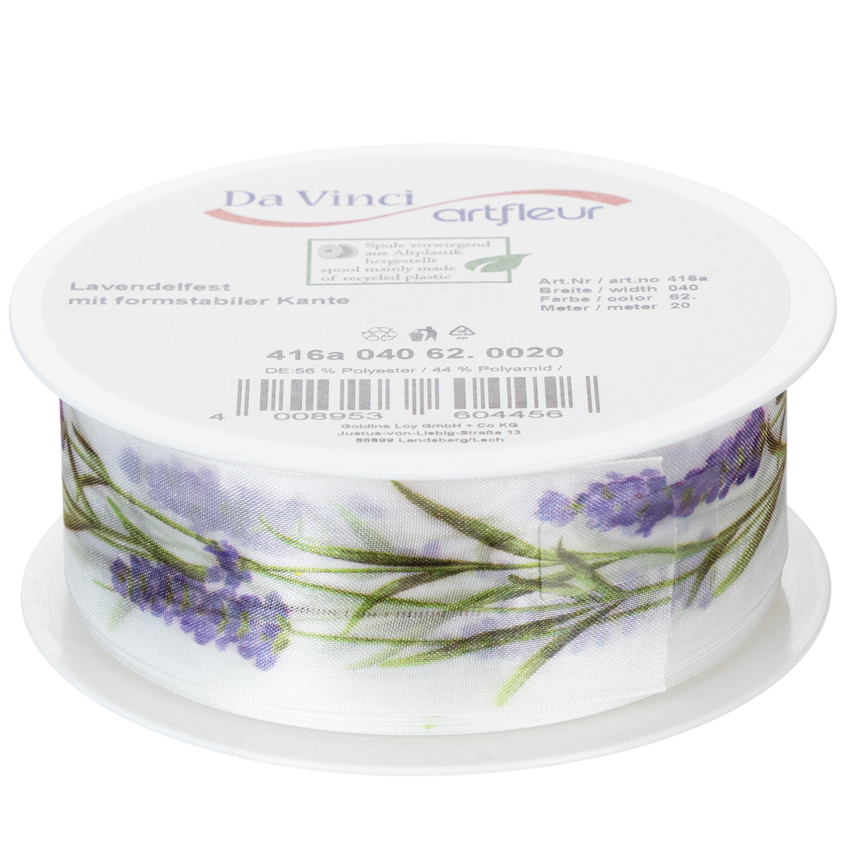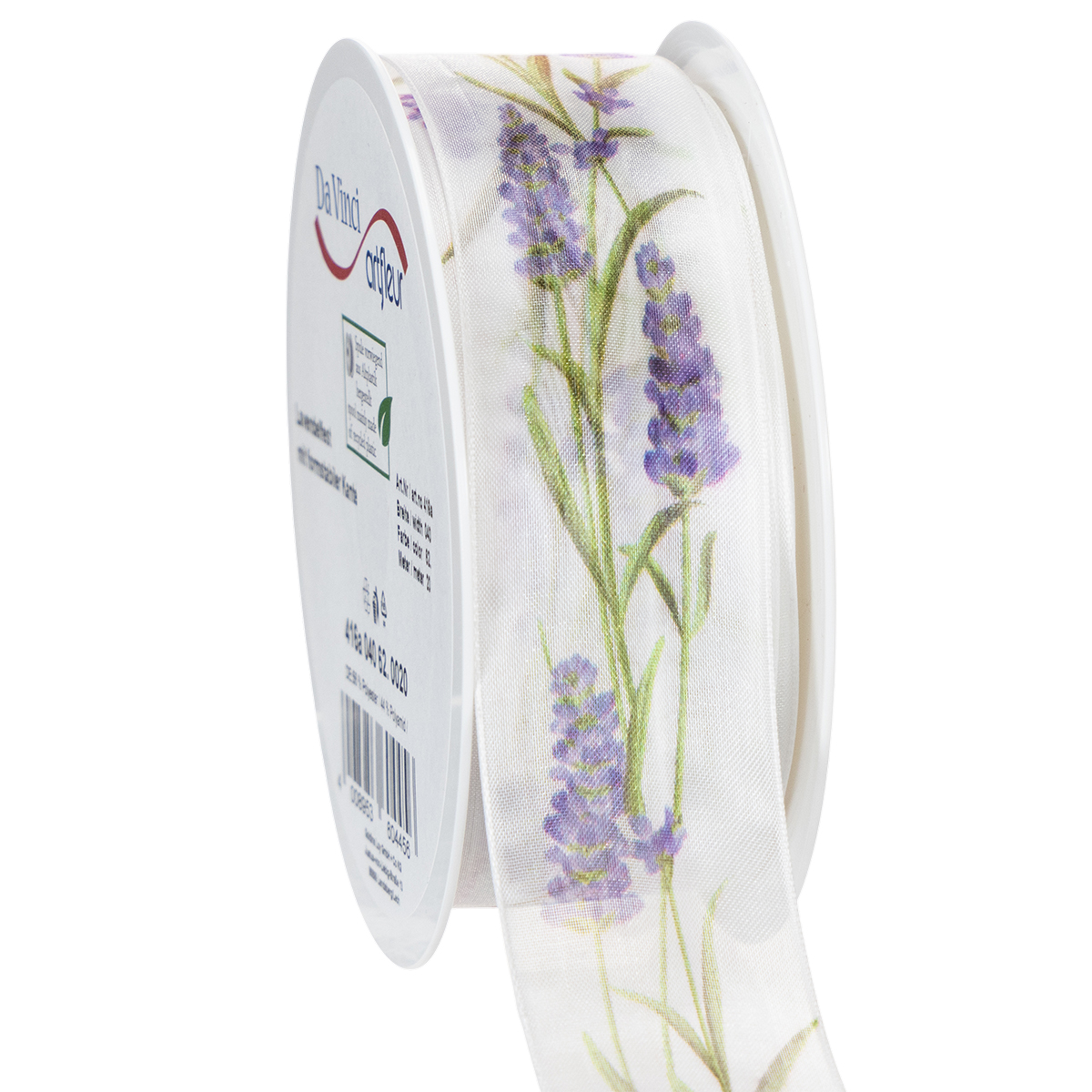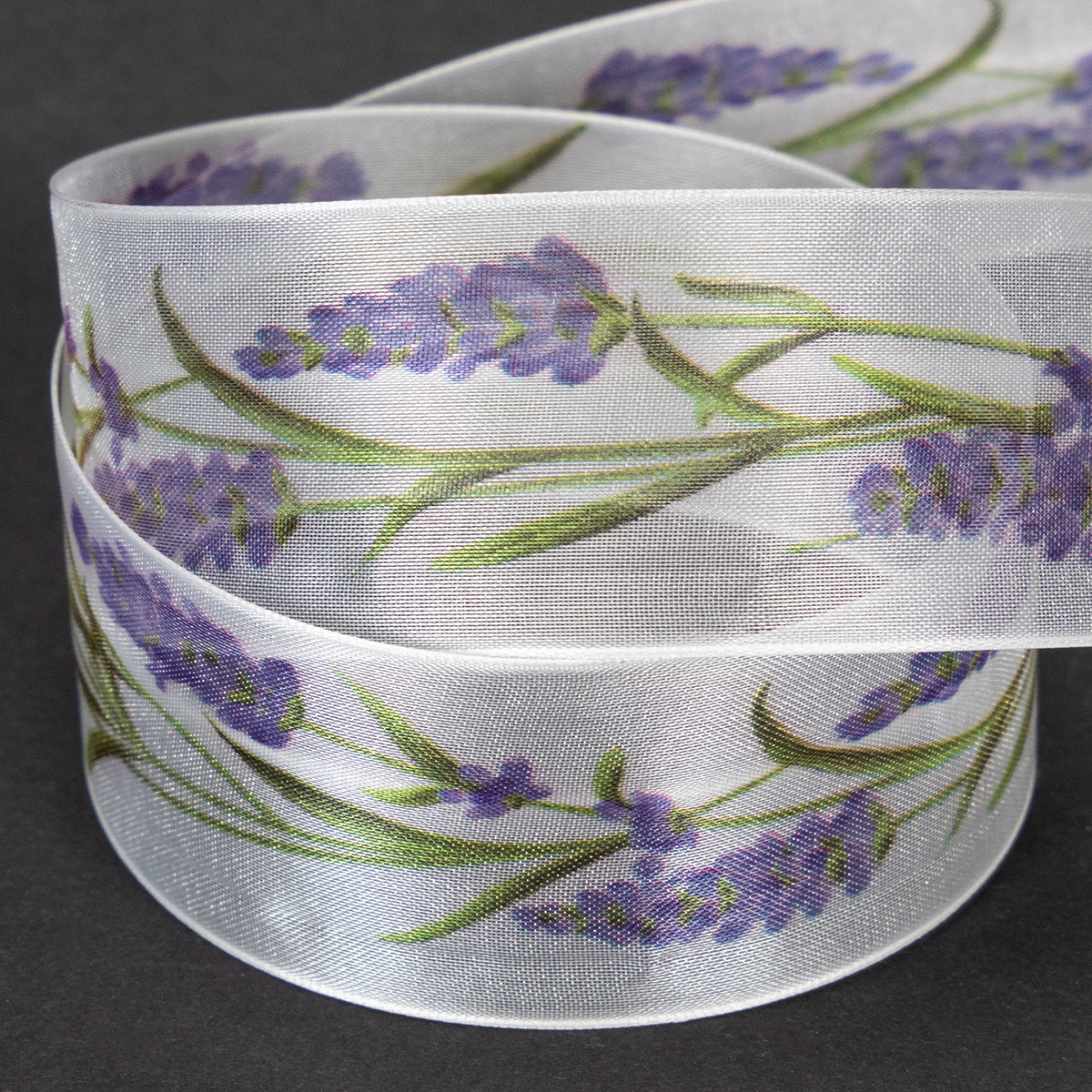 The lavender motif looks fresh and colorful on the white background of the organza ribbon. With its transparent organza weave, the chiffon ribbon is light and has a characteristic shimmer, while the shape-retaining edges ensure that bows look picturesque.