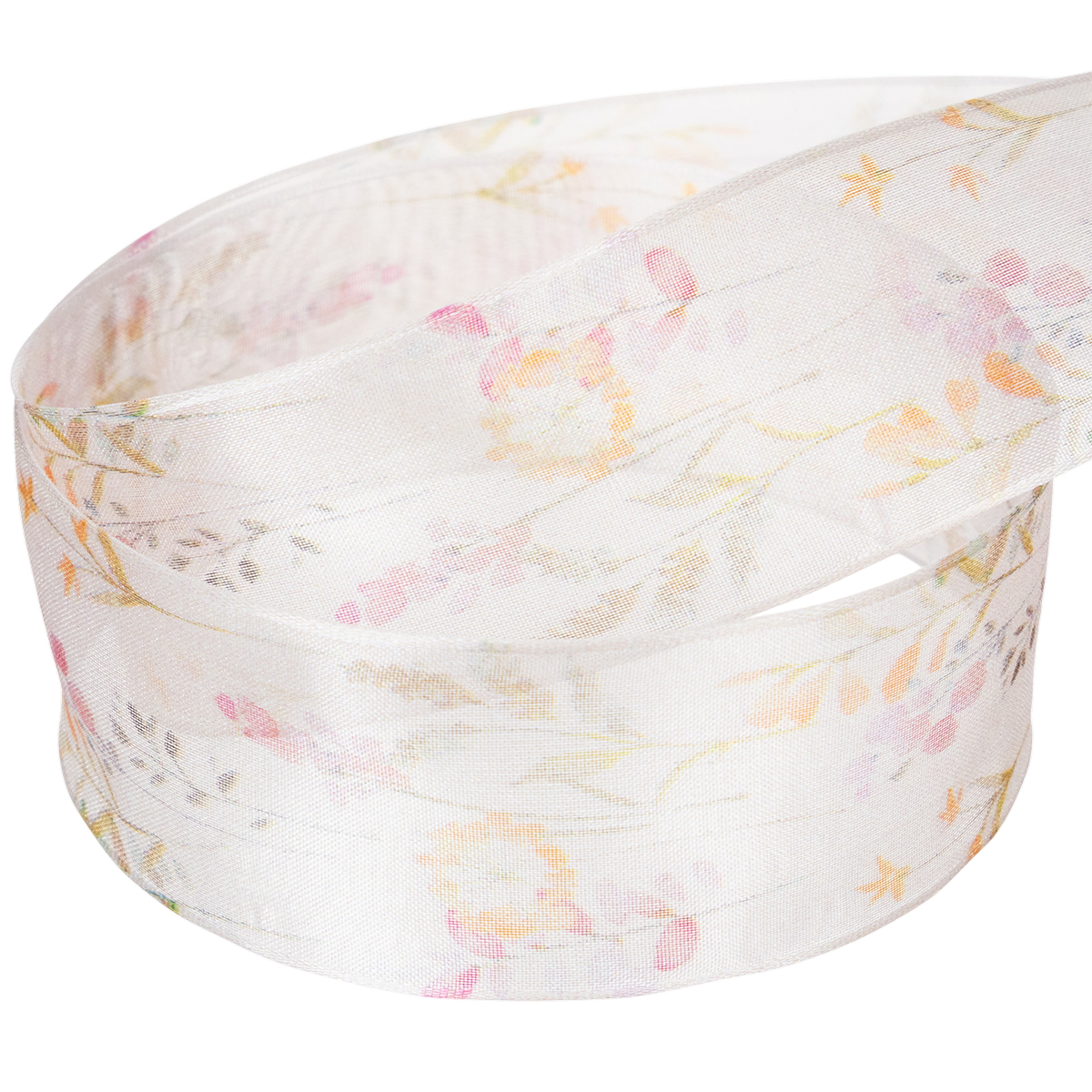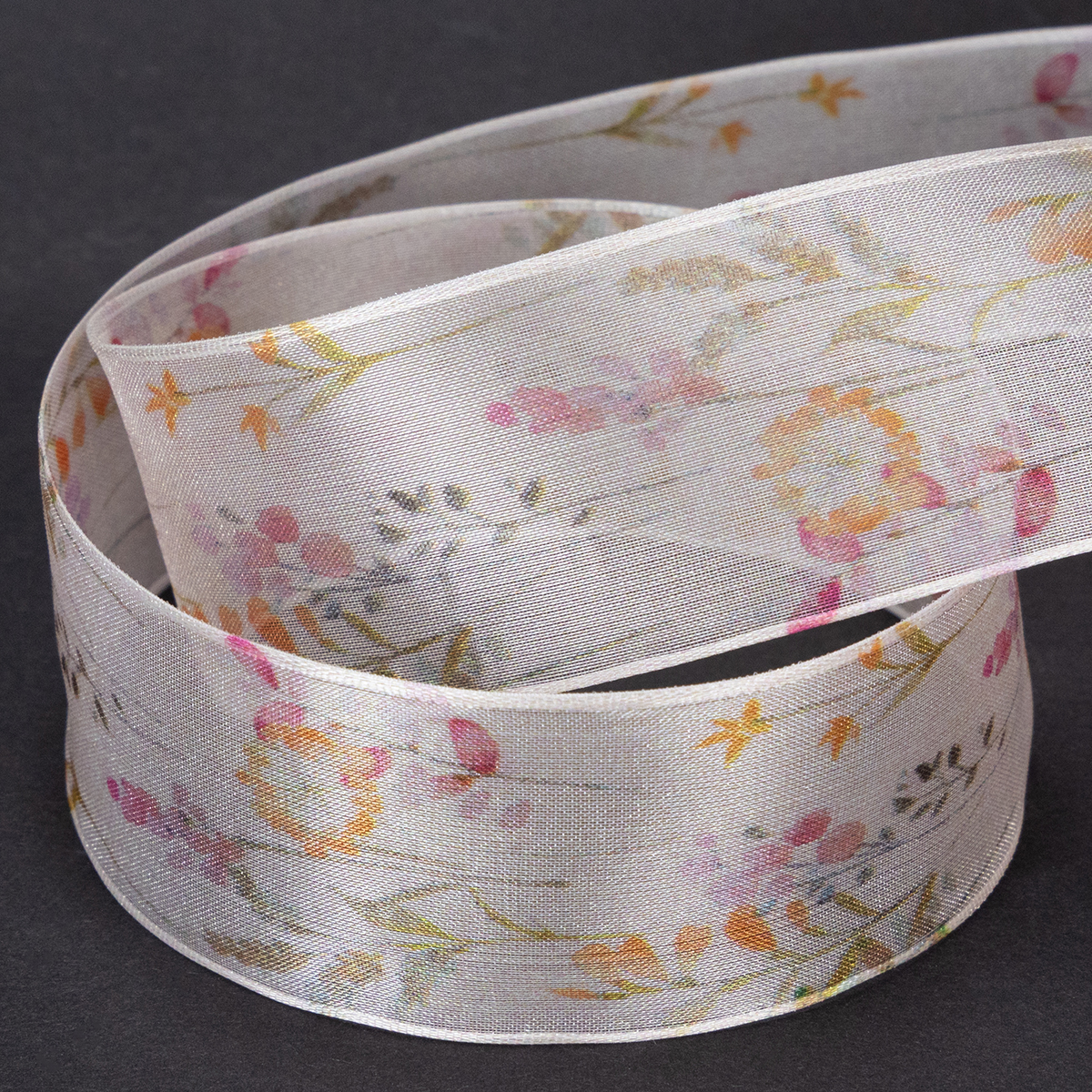 With the silky shimmer typical of organza fabric and the subtle color scheme between pink, apricot and orange, the flower and plant motifs look like they come from a Japanese garden. As fragrant and delicate as the ribbon looks, shape-retaining edges allow you to tie bows that look exactly as you hoped!