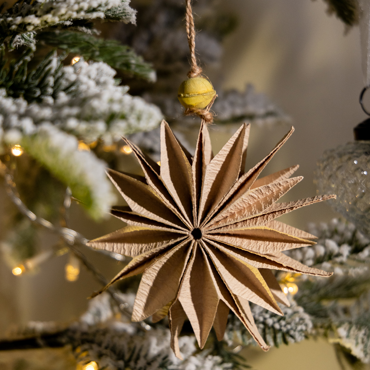 Our natural-colored paper stars are not only a real eye-catcher, but also incredibly practical. The understated color scheme creates a warm, cozy atmosphere without being overpowering. The yellow polystyrene bead adds a subtle pop of color that looks especially beautiful when combined with fairy lights or other natural materials like wood or pine cones. You can use the stars in a variety of ways: hang them on the Christmas tree, a wreath, or decorate your windows. They are particularly striking when paired with white or gold lights.
