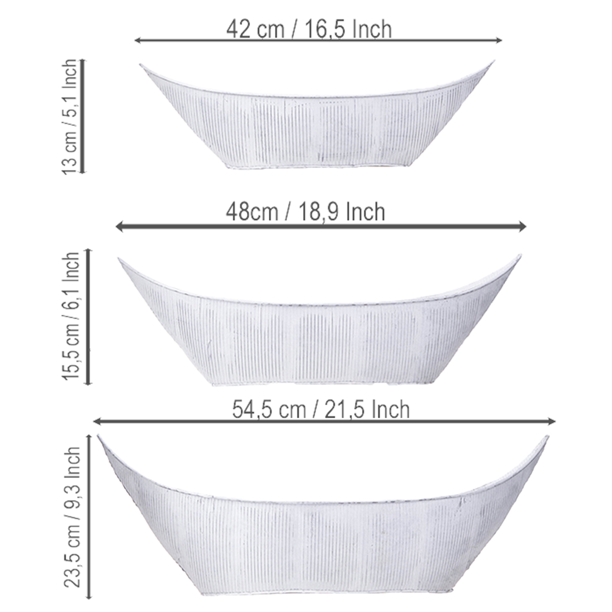 Plant pot, boat-shaped, metal, white/silver, 54.5/48/42cm, set of 3