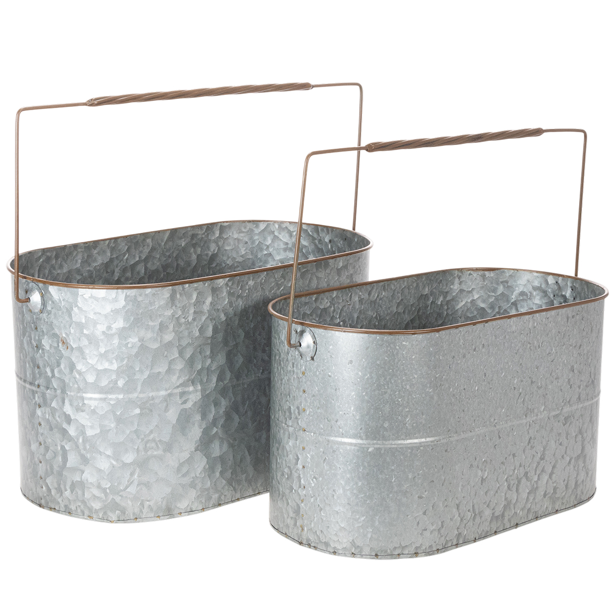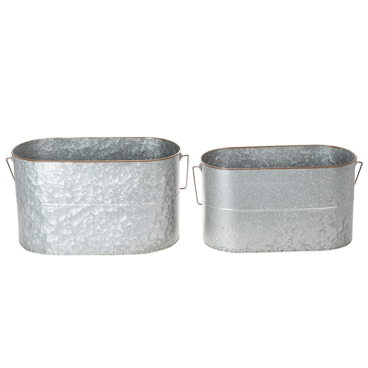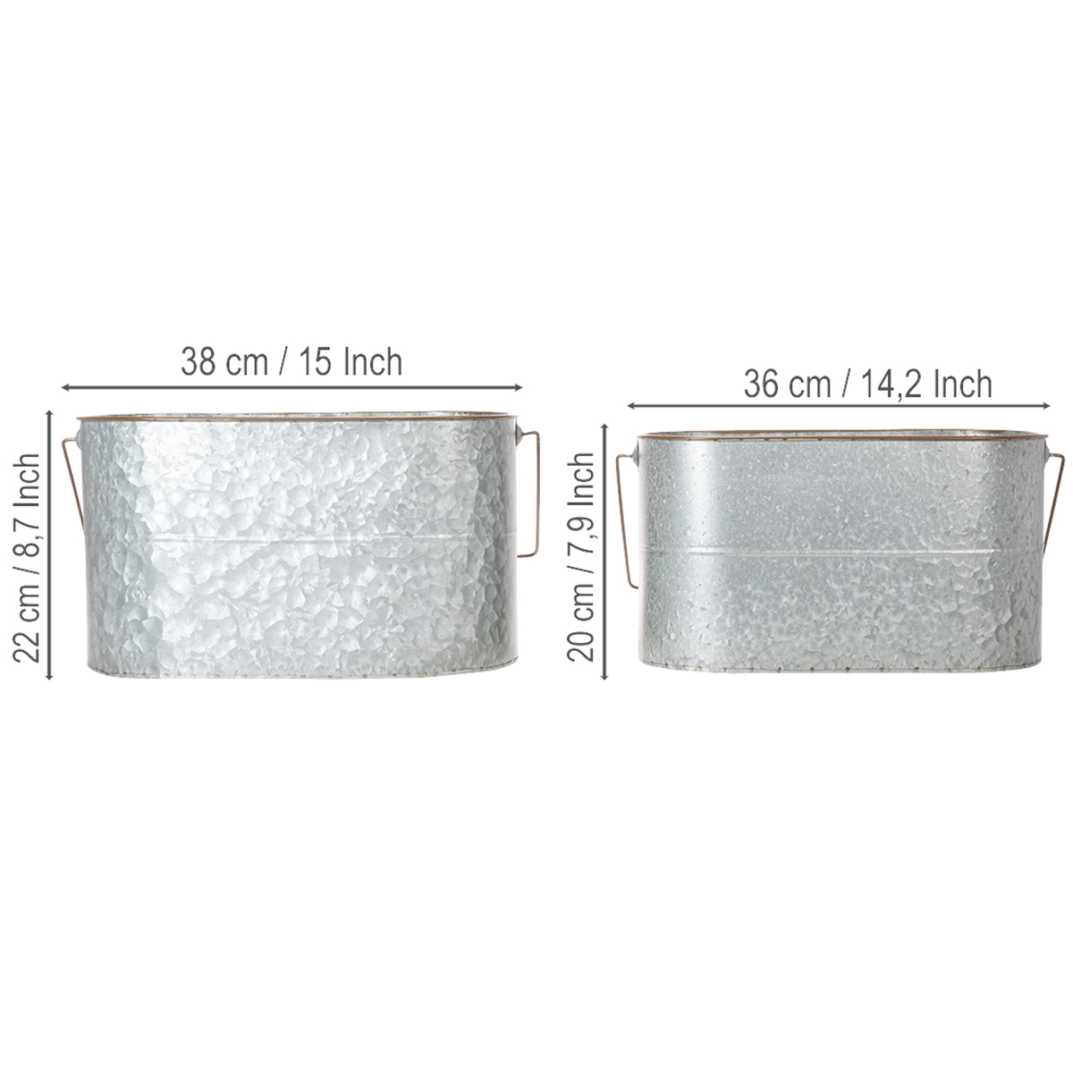 Plant pot with handle, metal pot, planter, silver, brown, H22/20cm L42/40cm, set of 2
