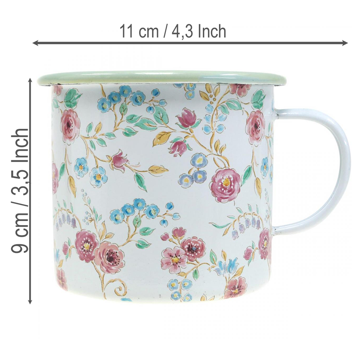 In light pastel colors on a white background, the planter with roses offers enamel decoration that nostalgically evokes summer. The decorative mug with handle has a pastel-colored rim in light green and is printed all around on the outside with a richly ornate floral motif. The plantable cup can be filled with a thin layer of gravel or sand as drainage and soil, or with dry or wet floral foam.