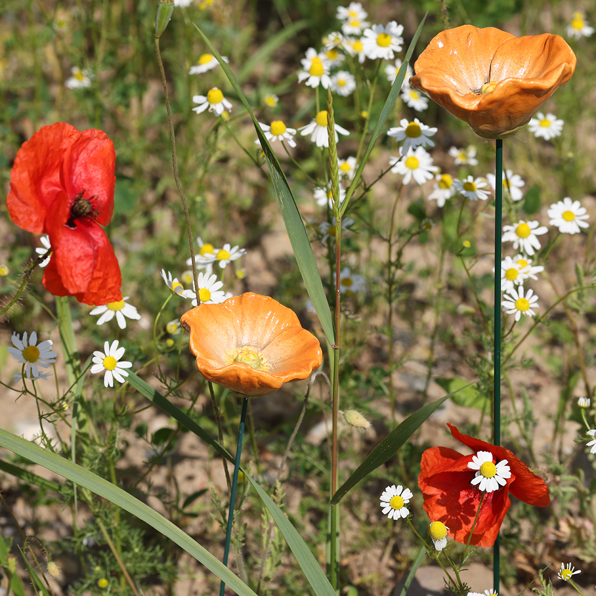 Our poppy garden stakes combine appealing design with superior quality. Crafted from meticulously finished ceramic, they impress with their high-quality feel and intricate details. The warm orange and white tones of the petals create a vibrant effect, brightening up any garden. Thanks to their handcrafted look, the stakes exude an artful naturalness that fits perfectly into a Mediterranean or country-inspired garden arrangement. Combine these flowers with green plants or neutral flowerpots – they blend in harmoniously while still making a clear statement.
