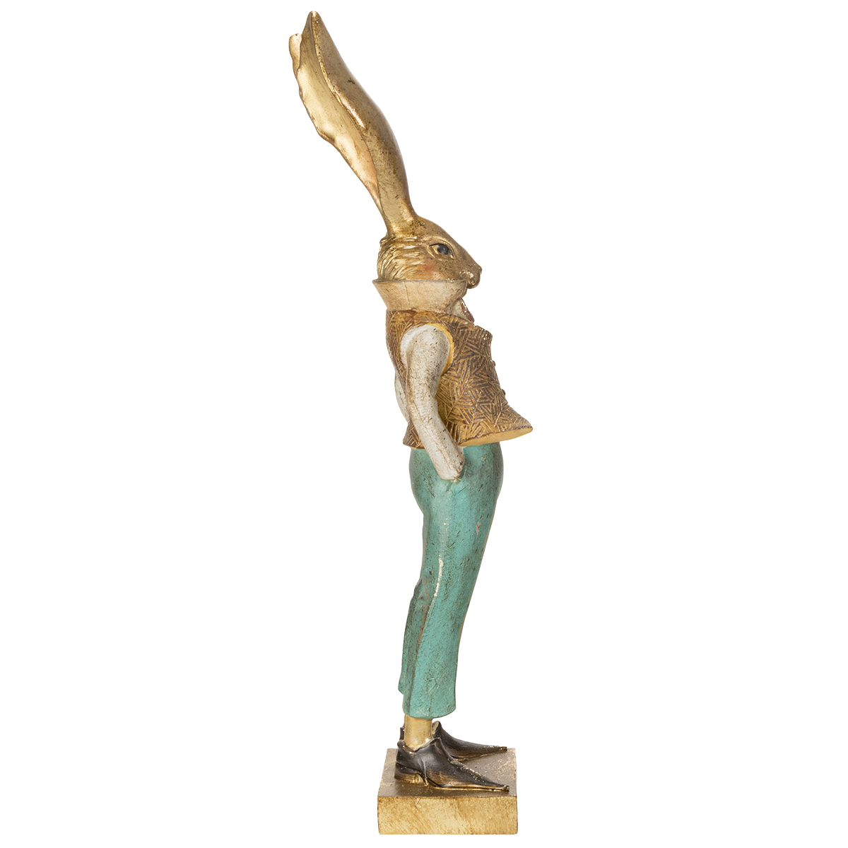 This rabbit figurine impresses with its harmoniously coordinated design. The warm brown tone of the body and the delicate green of the trousers create a pleasing contrast that appears both modern and timeless. The polished details of the polystone, in particular, give this figurine a vibrant and lifelike appearance. Have you noticed how lovingly the small details have been placed? From the charming facial expression to the golden accents on its outfit – here, classic Easter decoration meets modern chic.