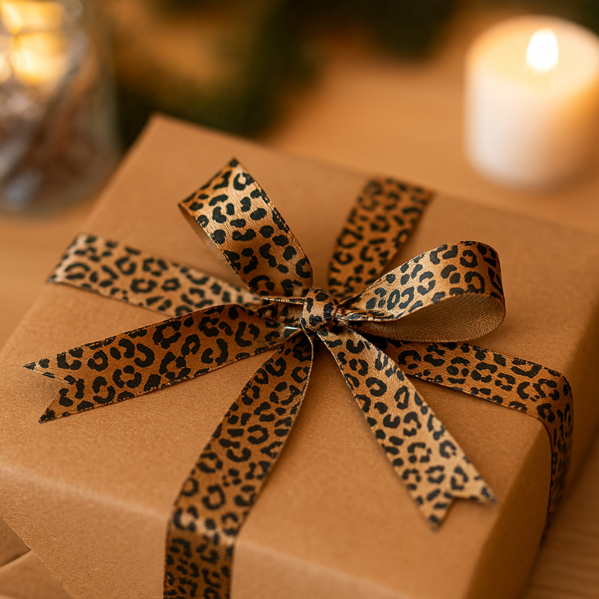 This beautiful leopard-print ribbon is perfect for adding a special touch to your gift wrapping, DIY projects, or decorations. The combination of a copper-brown, shiny fabric and a black leopard print on a ribbon approximately 15 mm wide exudes a sense of exclusive elegance. A touch of wildness combined with the smooth, luxurious texture of silk is simply irresistible! Whether for festive occasions, as a bow for gift wrapping, or even as a fashionable hair accessory, this ribbon is always a good fit. Whether you prefer a classic or modern style, this leopard-print decorative ribbon will add character to any of your projects. Next time you gift wrap, see how this accessory instantly turns heads!