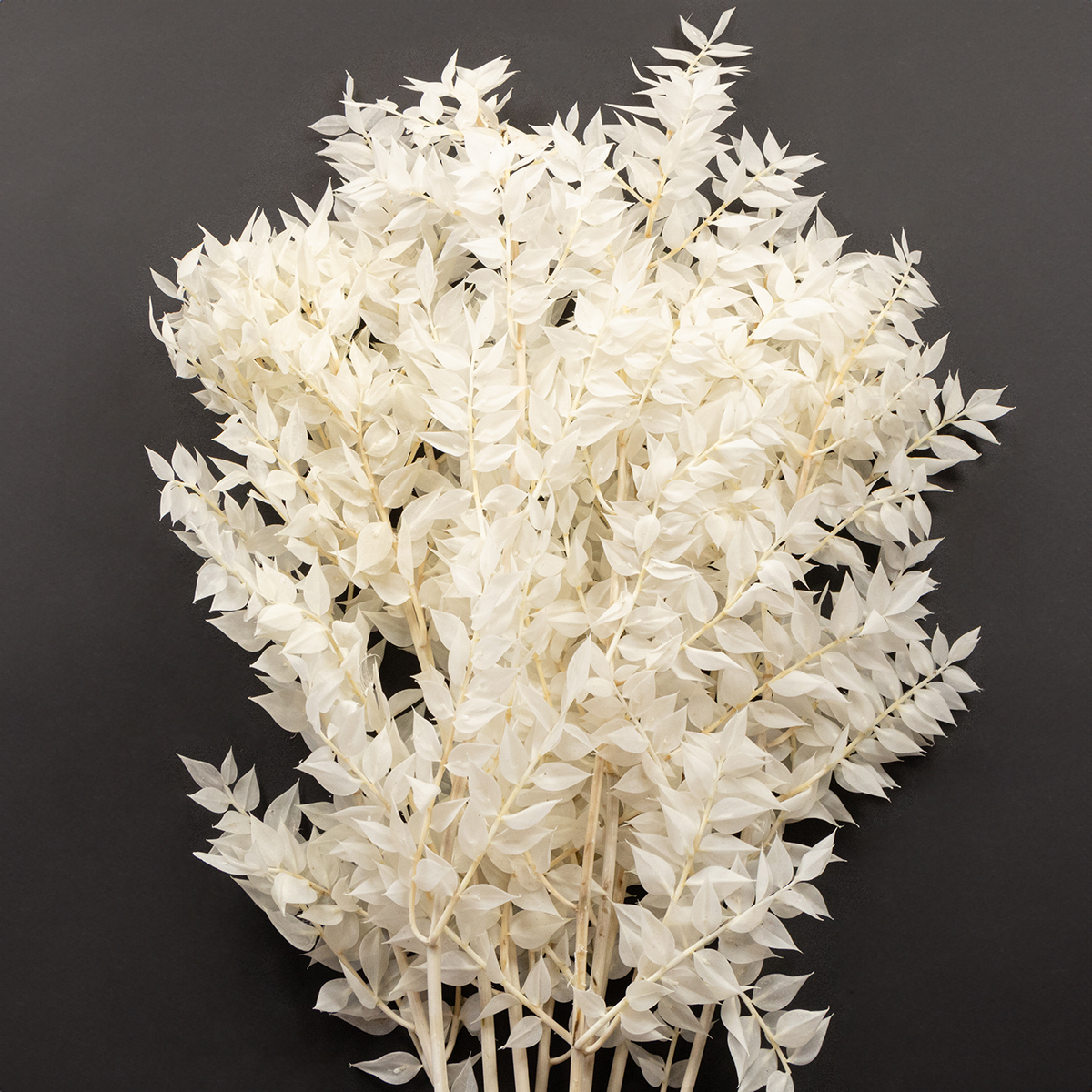 Ruscus, or butcher's broom, is cut into branches of approximately equal length and carefully dried and bleached or dyed. The bleached Ruscus branches have a slightly translucent shimmer in places when used in decorations.