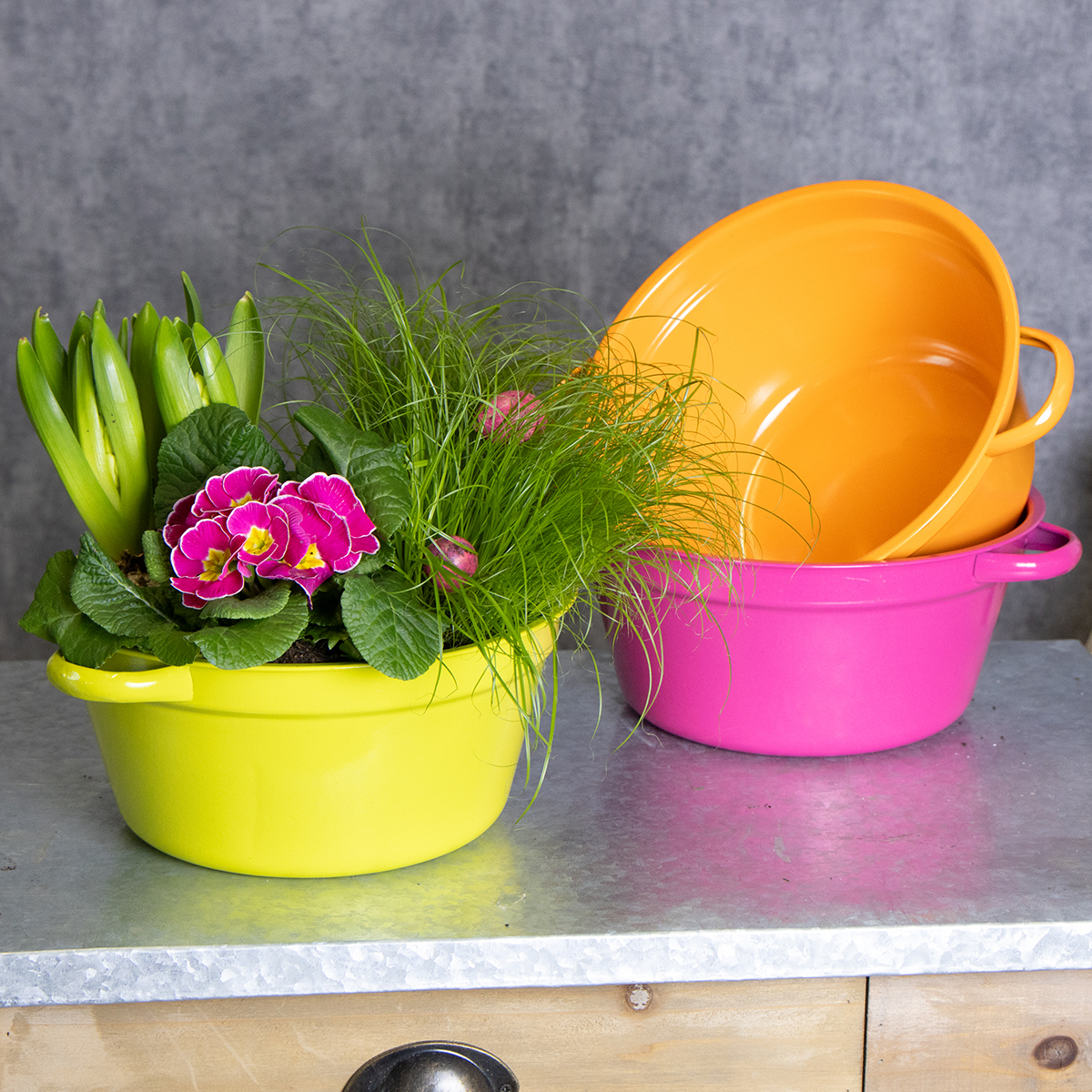 Our metal planters charmingly combine function and style. They radiate green, orange, and pink – a trio that instantly brightens your mood. With a diameter of 25 cm and practical handles, they are easy to move and perfect for a variety of arrangements. Whether for your living room, windowsill, or balcony: these planters make it easy to create your own little herb garden, pretty flower arrangements, or creative gift ideas. Imagine them decorated with colorful spring flowers, succulents, or fresh herbs – simply wonderful, isn't it?