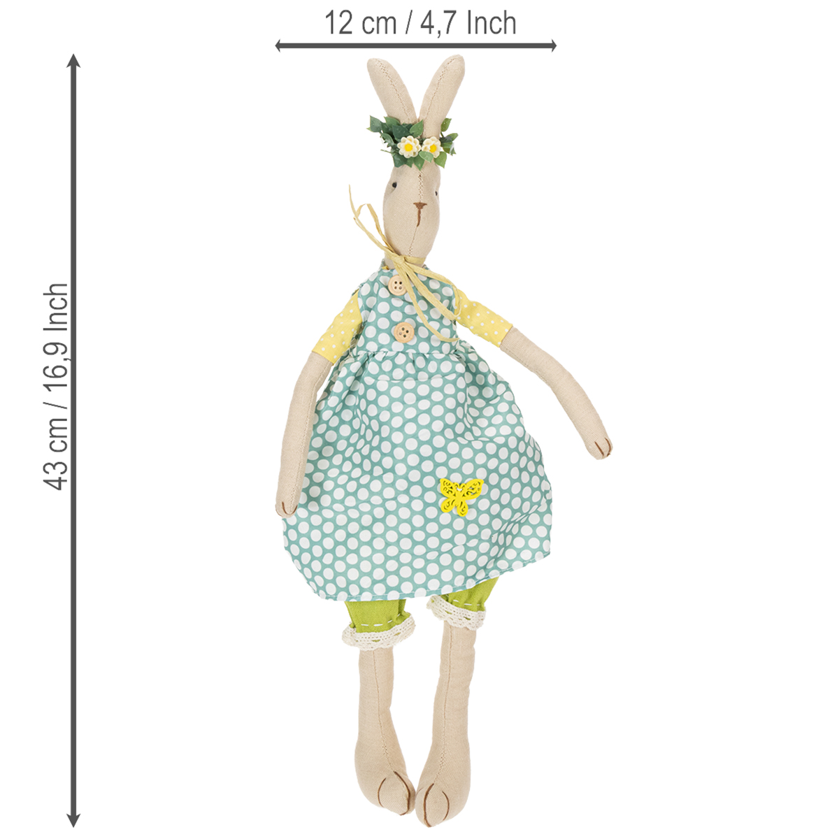The cute bunny girl is made of a simple natural fabric and wears a spring-like blue dress with large white dots. Underneath, sleeves in yellow and white and pretty green harem pants with lace edges complete the outfit of the bunny with dress. The beautiful rabbit also enchants with wonderful details such as wooden buttons and a butterfly decoration on the robe as well as a simple bow made of paper ribbon around the neck. The stuffed bunny wears a filigree wreath of flowers on its head, which completes its look.