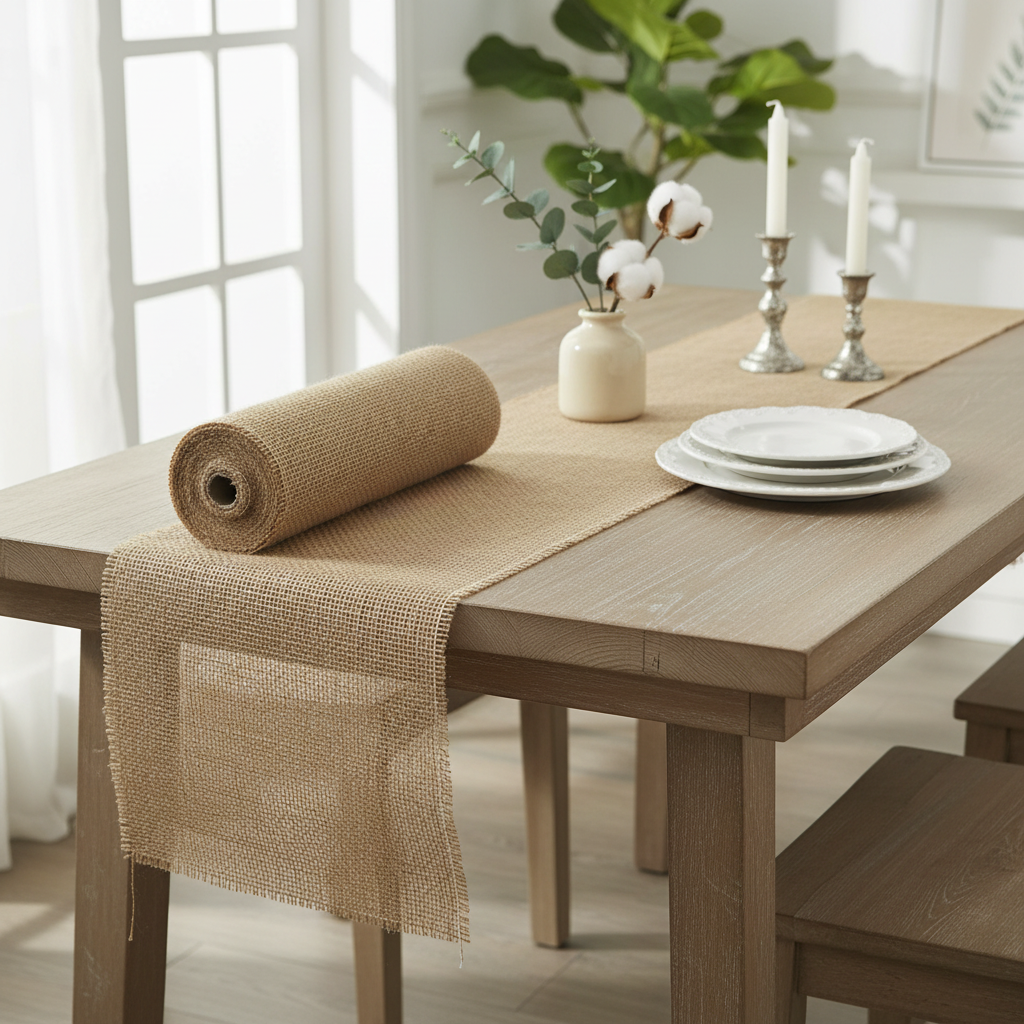 The Juteband in nature as a table runner is wound into a roll and can be rolled up very easily. The jute deco ribbon has a length of about 10 meters and a width of about 30 centimeters.