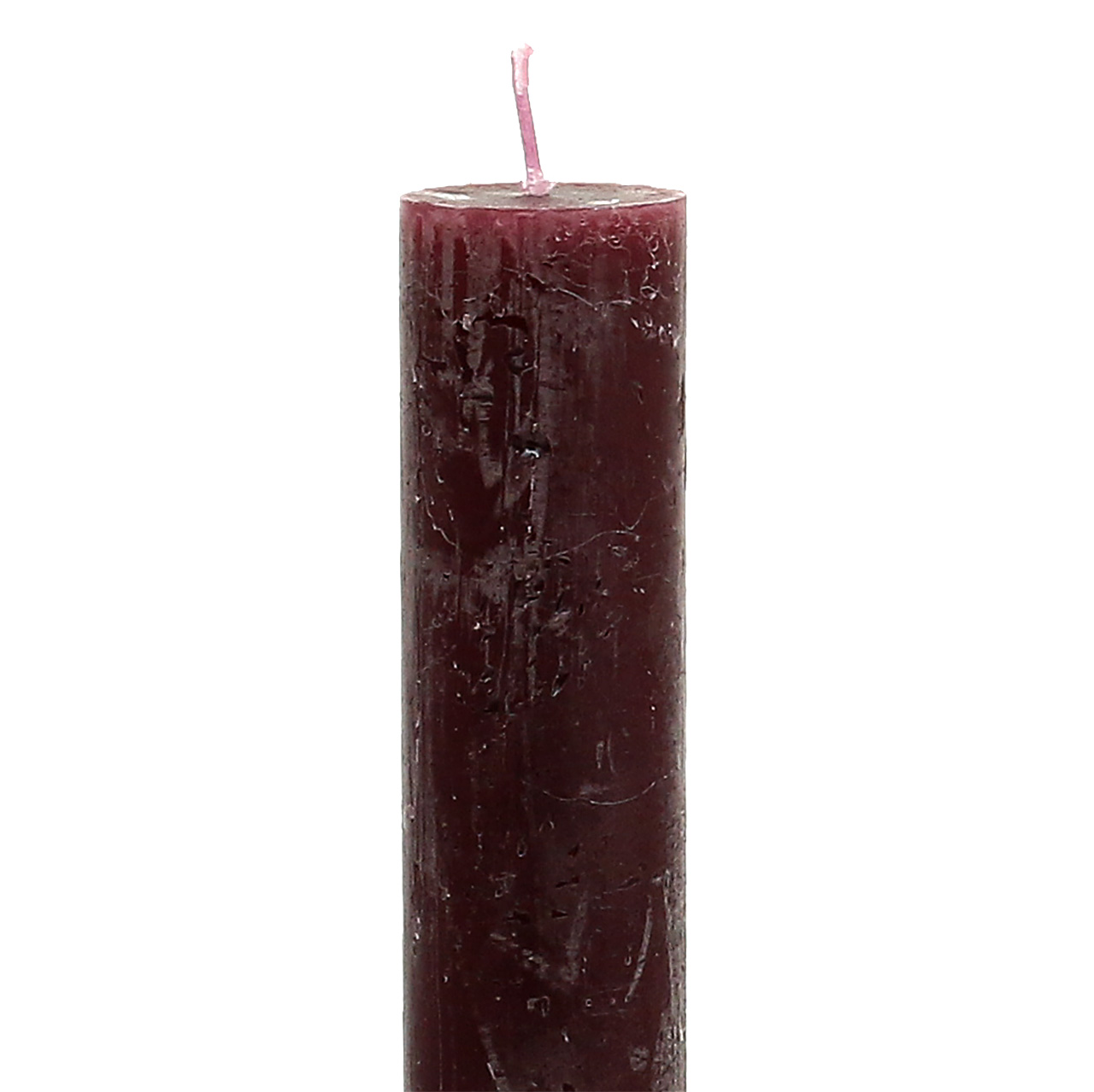 You will receive the colored candle candles in Burgundy in a set of 4 in a plastic and cardboard packaging. The wax candles measure about 240 millimeters in height and about 34 millimeters in diameter. Its burning time is about 24 hours.