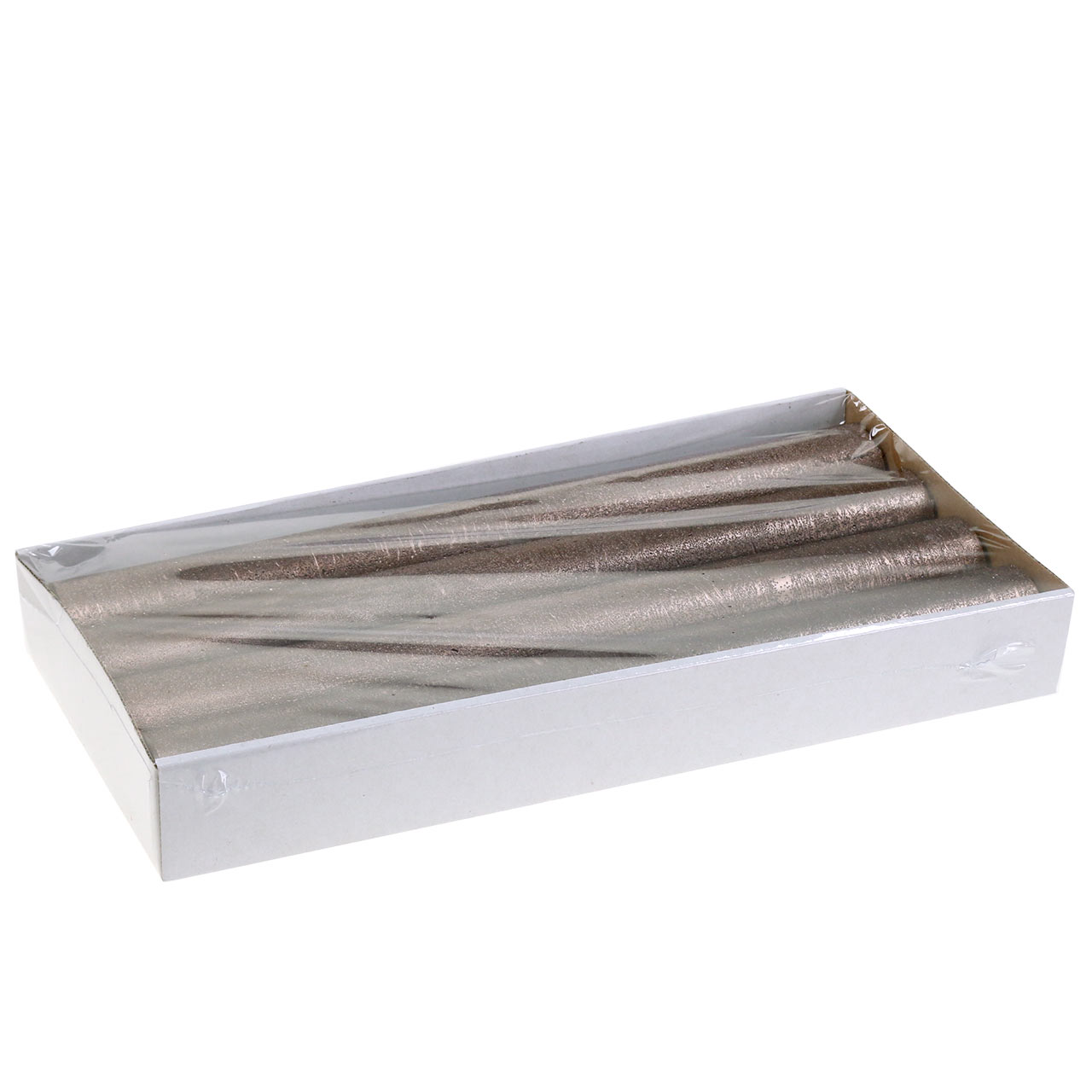 The solid-colored copper candles with the shiny metallic coating are available as a set of 4 in a shrink-wrapped cardboard box. Each candle is approximately 240 millimeters in height and approximately 34 millimeters in diameter. The burning time of the quality candles is about 24 hours.