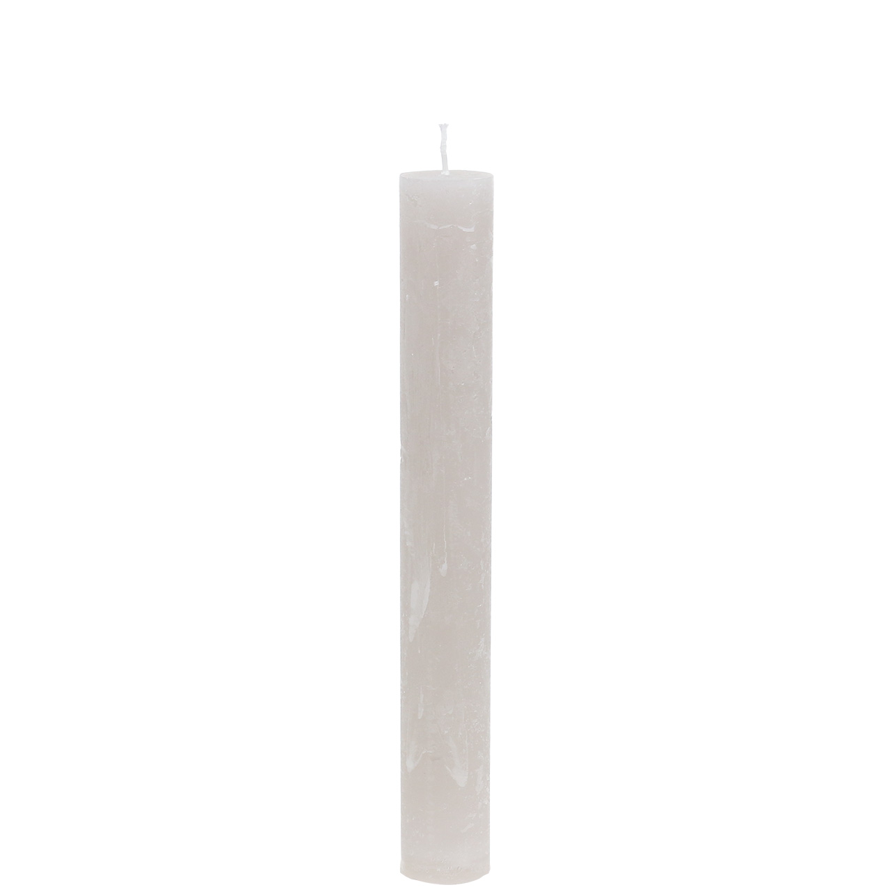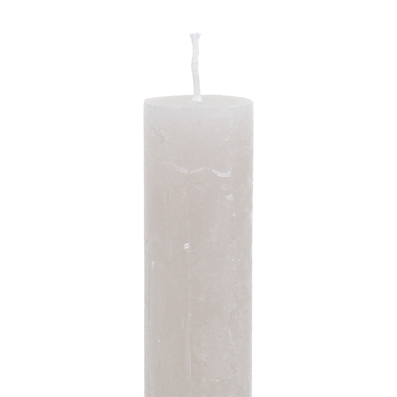 The through-colored, gray bar candles, which have only a few air pockets and thus are quite heavy, are offered in a set of 4 pieces in a cardboard and plastic packaging. Each candle has a burn time of about 24 hours and is approximately 240 millimeters high with an approximate diameter of 34 millimeters.