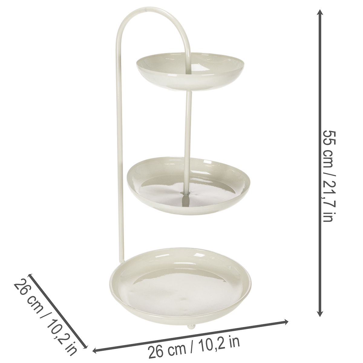 With its clean, modern look, this three-tiered serving stand fits into any room and adds a special touch to your decor. The three tiers have different diameters (26 cm, 23 cm, and 18 cm) and offer space for packaged food items or decorative elements. The neutral color scheme makes it easy to combine with other decorating styles – whether minimalist, Scandinavian, or even boho. The stand is also practical: it's easy to clean, space-saving, and sturdy. Perfect for use on the living room table, as a centerpiece on a wedding table, or for themed parties! Please note: it is not suitable for unpackaged food items, so it's ideal for chocolates, cupcakes in molds, or decorative figurines. Combine the stand with other Floristik24 items, such as a stylish table lamp or matching flower vases, to perfectly complete your ambiance!