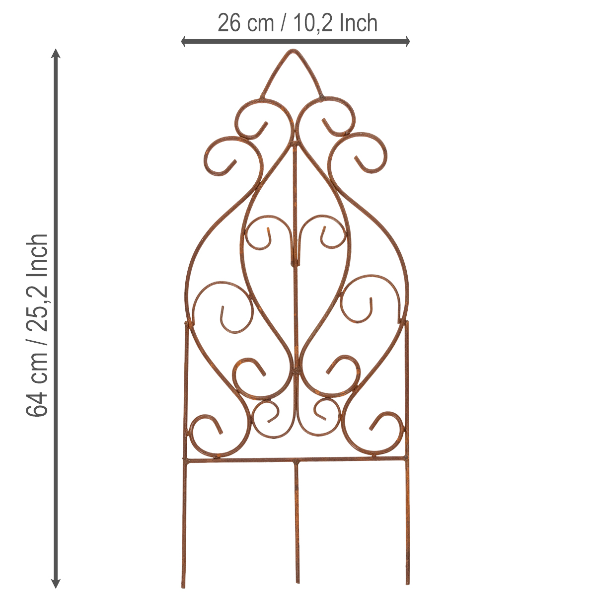 Do you dream of a garden paradise that enchants you anew each day? With this metal trellis in a sophisticated rust finish, you can create a romantic highlight in no time, stylishly showcasing your roses or climbing plants. Whether as an ornament in the rose bed, a subtle eye-catcher in the front garden, or elegant support for your plants in the flower bed – this trellis combines functionality with a decorative charm that makes a lasting impression. Made of high-quality metal, it is not only robust but also adds a special touch with its warm brown color and curved embellishments. Thanks to its dimensions of 64 cm in height and 26 cm in width, it fits versatilely into your garden design as a climbing aid and conjures up an inviting atmosphere in spring, summer, and beyond.