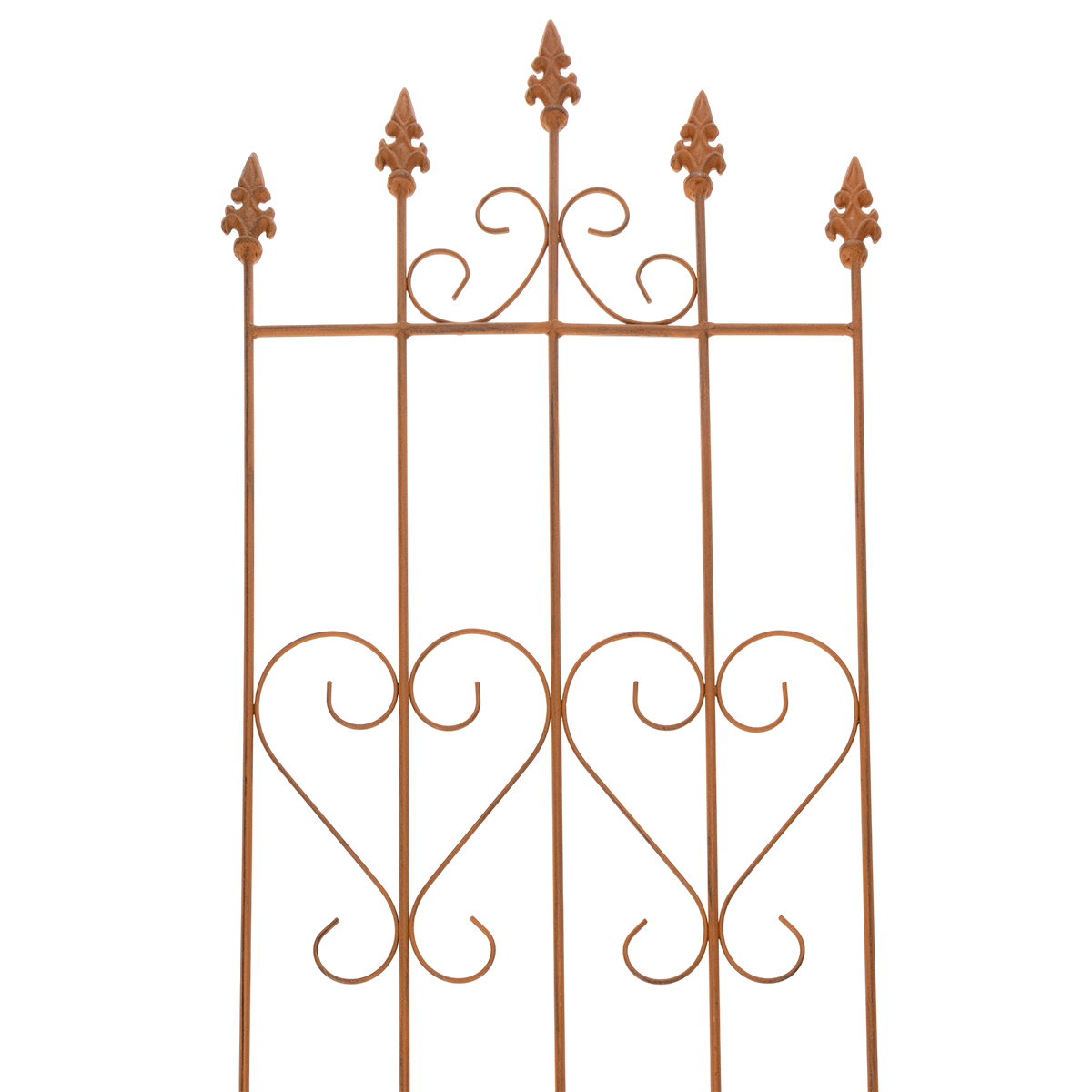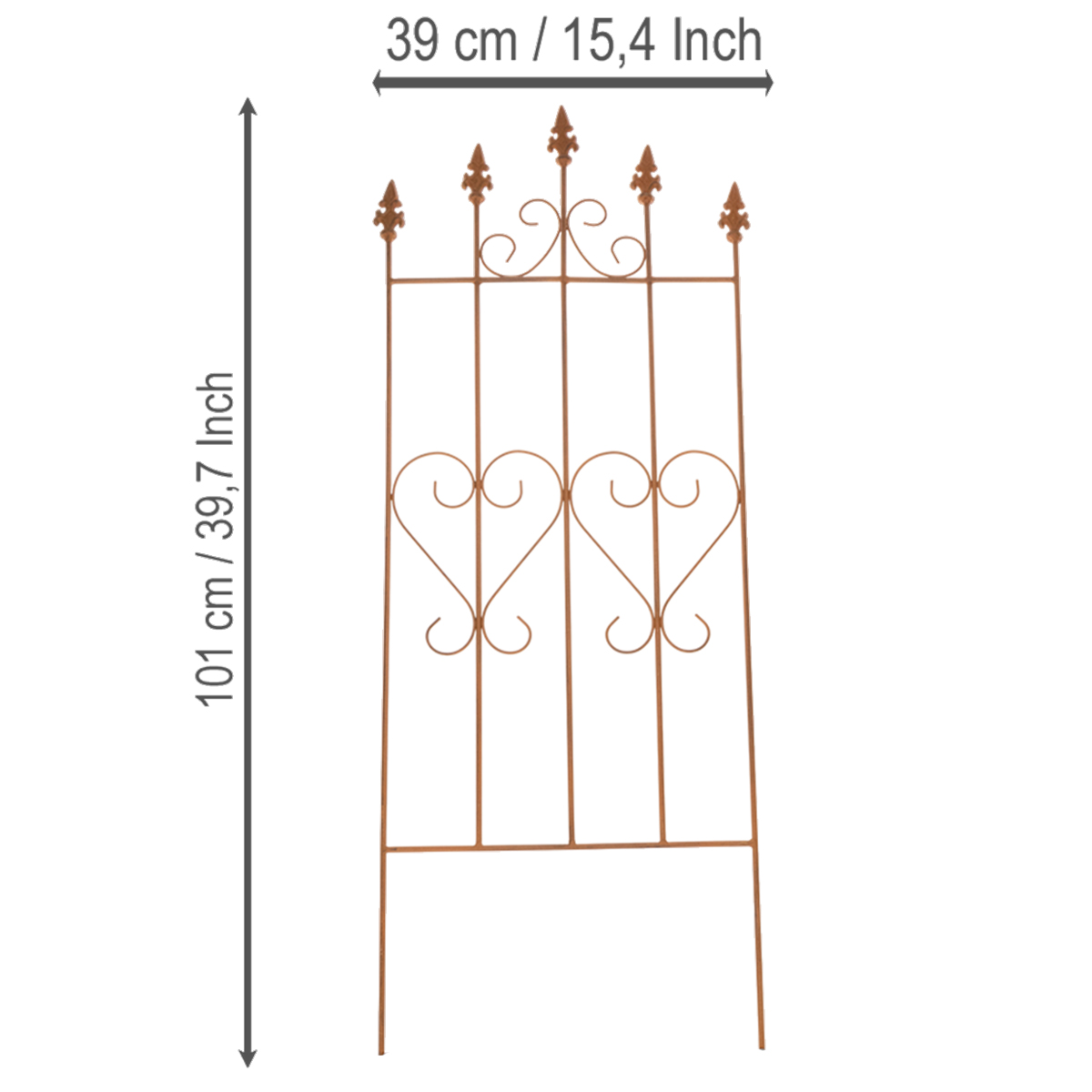 Let your garden bloom! This trellis, with its nostalgic heart motif, not only exudes a touch of romance but is also highly practical. Ideal for roses or as a charming visual border in the garden, this trellis adds a special touch to any outdoor space. Measuring 101 centimeters high, 39 centimeters wide, and 1 centimeter deep, it's both manageable and space-saving. The brown, weathered steel look harmonizes beautifully with natural green tones and vibrant flowering colors. Whether on the patio, in the front garden, or as a decorative addition to flowerbeds, this trellis is an essential home accessory for every nature lover.