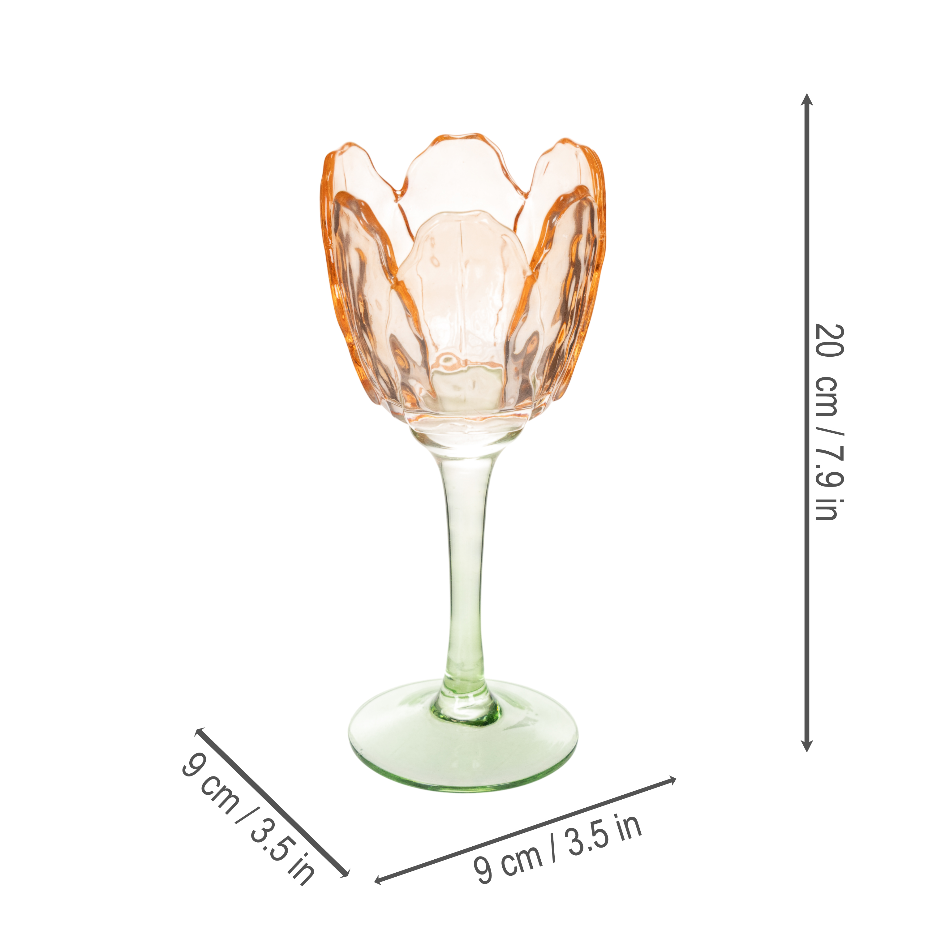 Do you long for a touch of nostalgia and a warm, romantic atmosphere in your home? This elegant vintage-style glass tealight holder delivers just that. The graceful tulip shape in delicate orange combines floral elegance with timeless charm. Made of high-quality glass, this 20-centimeter-tall tealight holder is a real eye-catcher, ideal for indoor or sheltered outdoor use. Whether on the dining table, in the living room, or as a stylish highlight at a romantic dinner, it adds a special touch to any room.