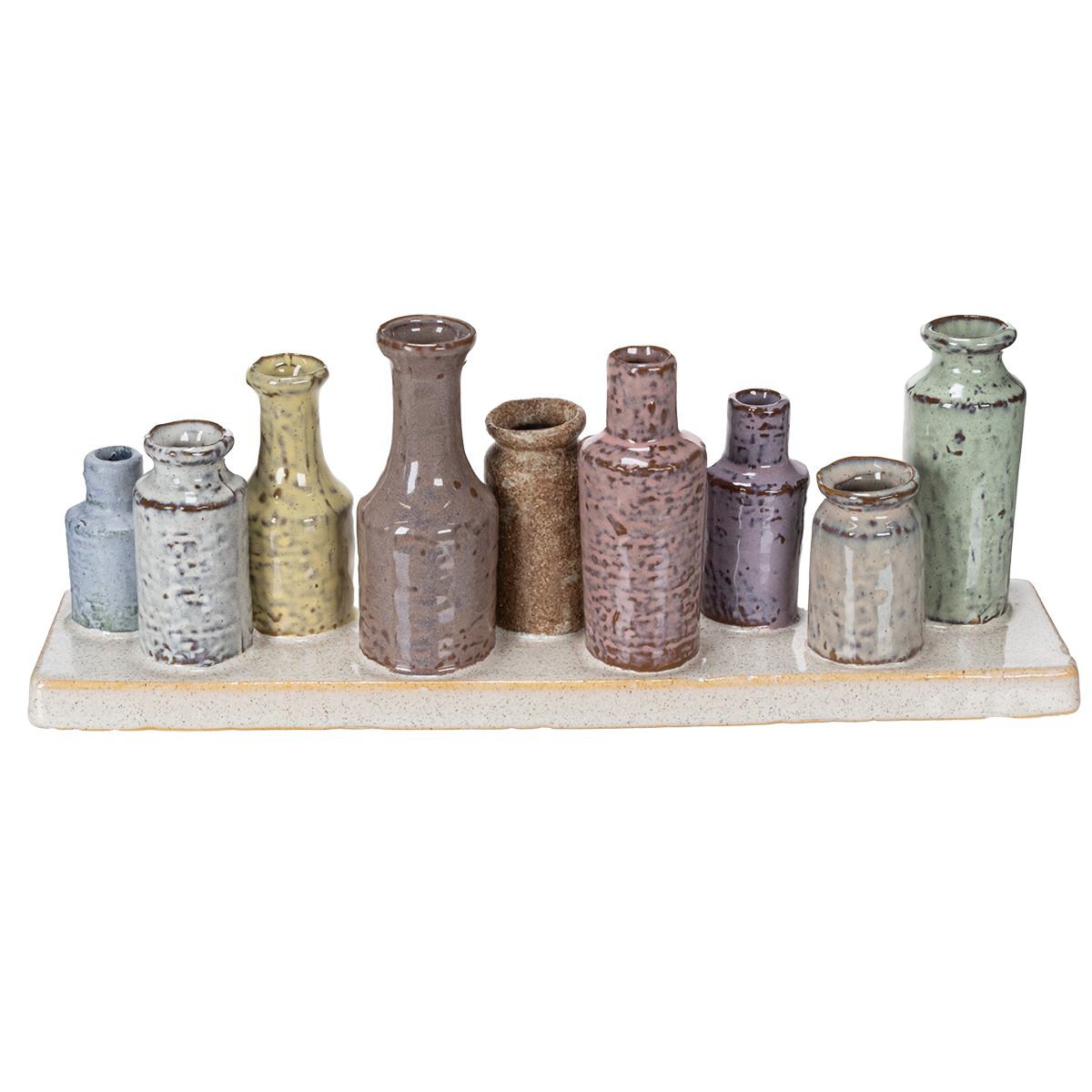 Create an inviting home with a decorative highlight that reflects your personality. This vase arrangement adds the perfect finishing touch to your living room, windowsill, or dining table. The coordinated combination of nine small, colorful ceramic vases on a wooden stand is a true gem. Whether it's a fresh bouquet of spring flowers or an arrangement of dried flowers, this set transforms any decoration into a real eye-catcher. The best part? The vibrant vases instantly bring a pleasant, homey feel to any room. From vintage to boho style, this designer vase set blends harmoniously into any setting. A high-quality decorative element that stands out subtly yet charmingly with its color palette of brown, yellow, green, and white.