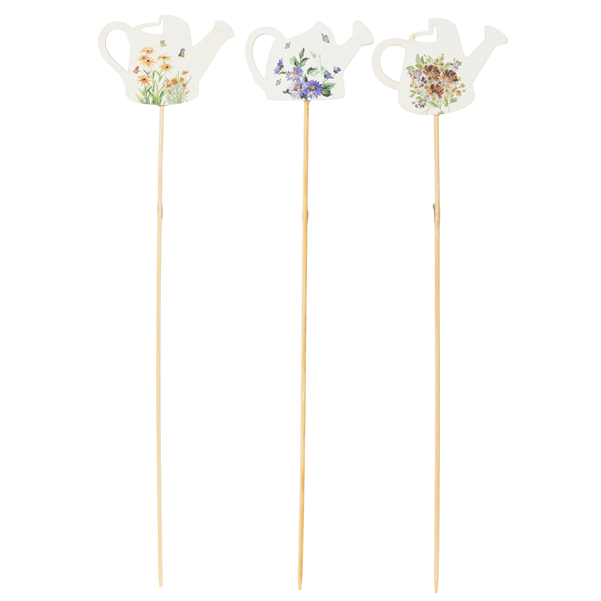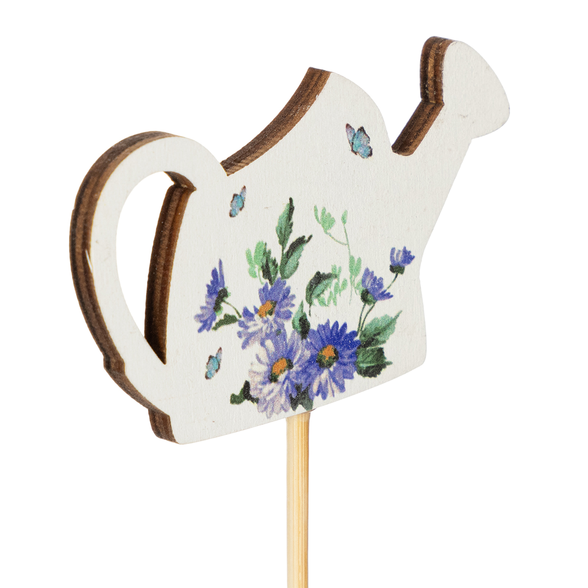 Our watering can decorative stakes combine the best of decoration and functionality. Standing 34 cm tall and featuring a sturdy wooden stake, they can be easily placed in soil, moss, or floral foam. The delicate floral motifs in refreshing natural colors add a special touch to any arrangement.