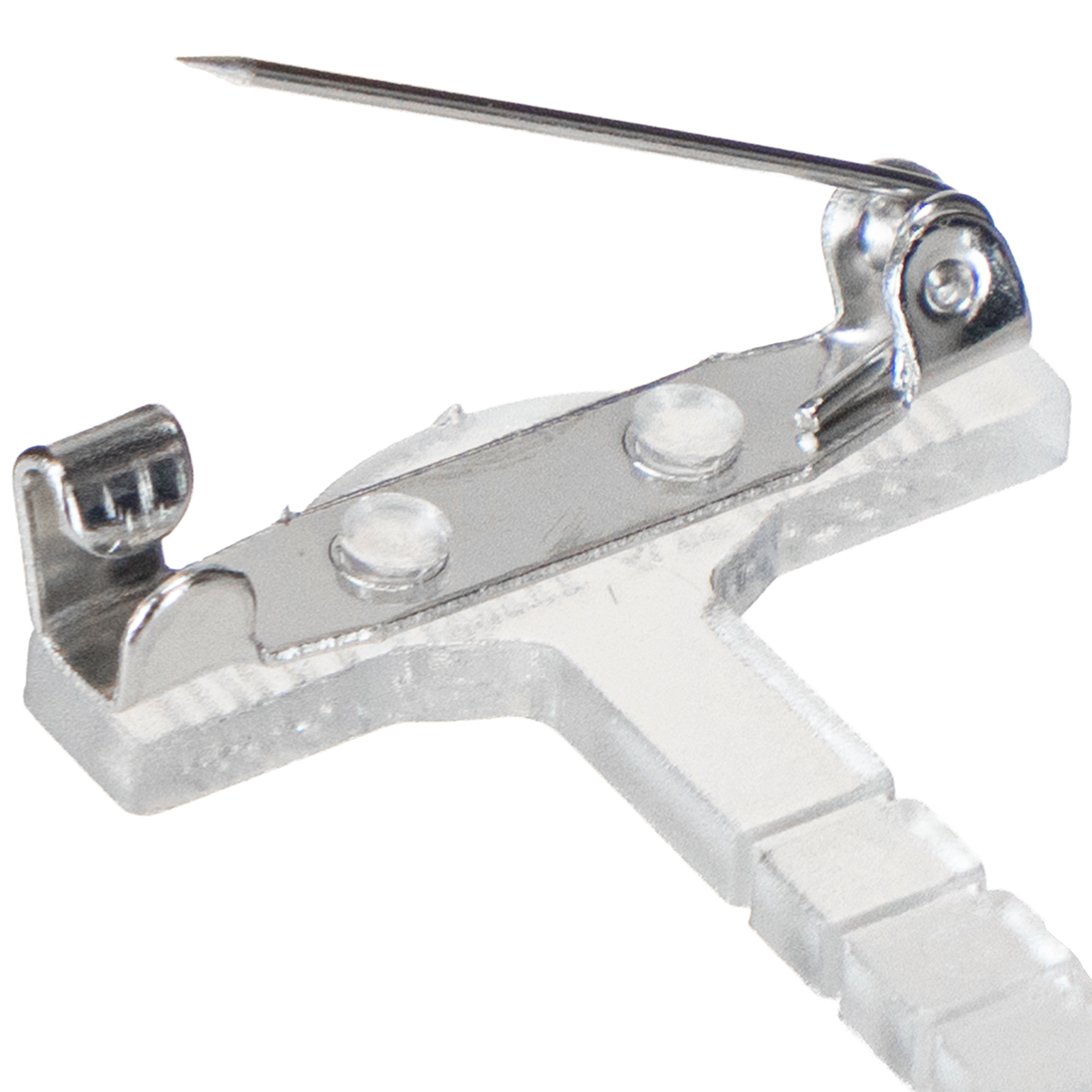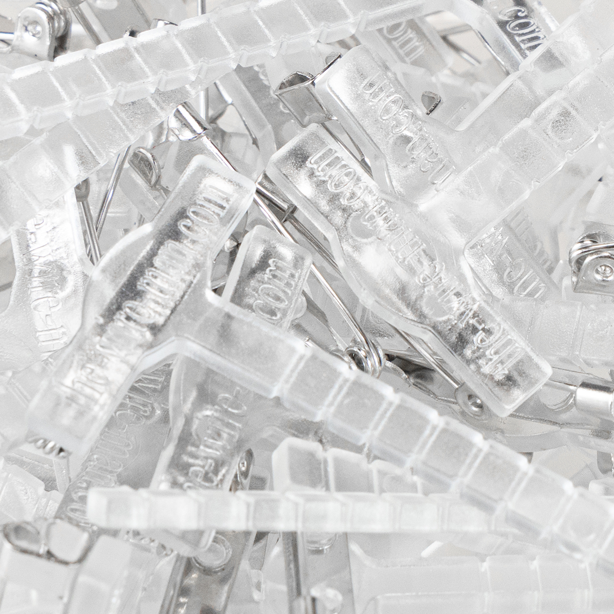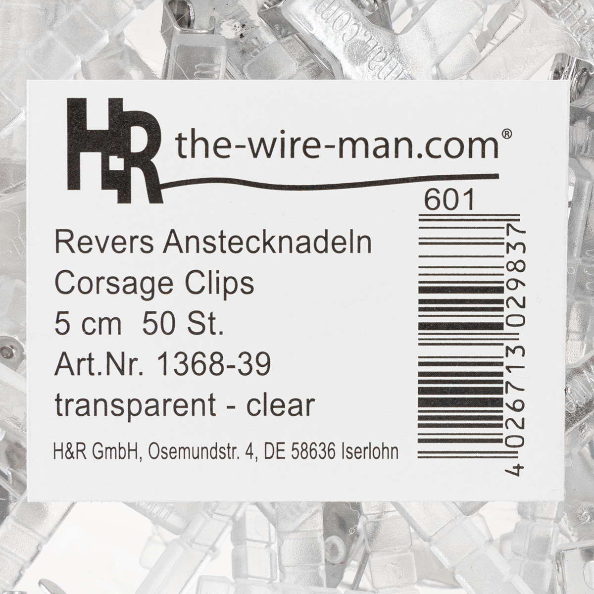 The wedding pin made of transparent plastic and a silver needle is delivered in a box to a total of 50 pieces and has a length of about 5 centimeters. So you can also use the badge to attach name tags for a workshop, small figures for a theme party or floral jewelry for a gala evening there.