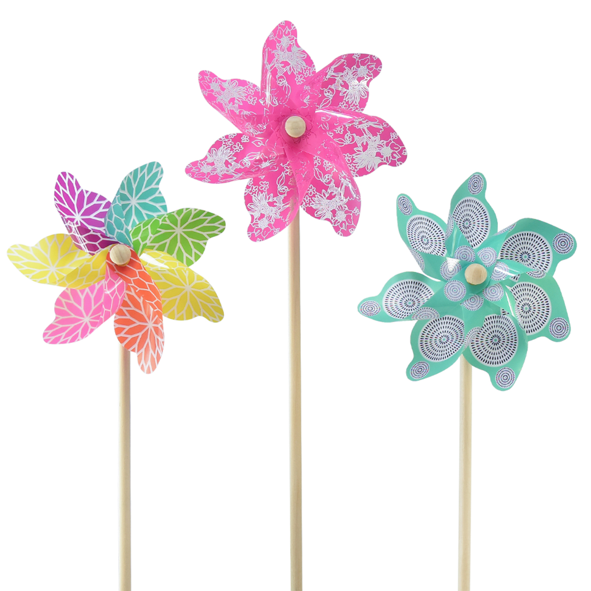 You get a total of 3 windmills, which differ in pattern and color. One windmill is pink and decorated with a partially transparent flower pattern. The turquoise windmill has black and white circles and the third has a different color on each leaf, broken up by a large white-bordered flower.