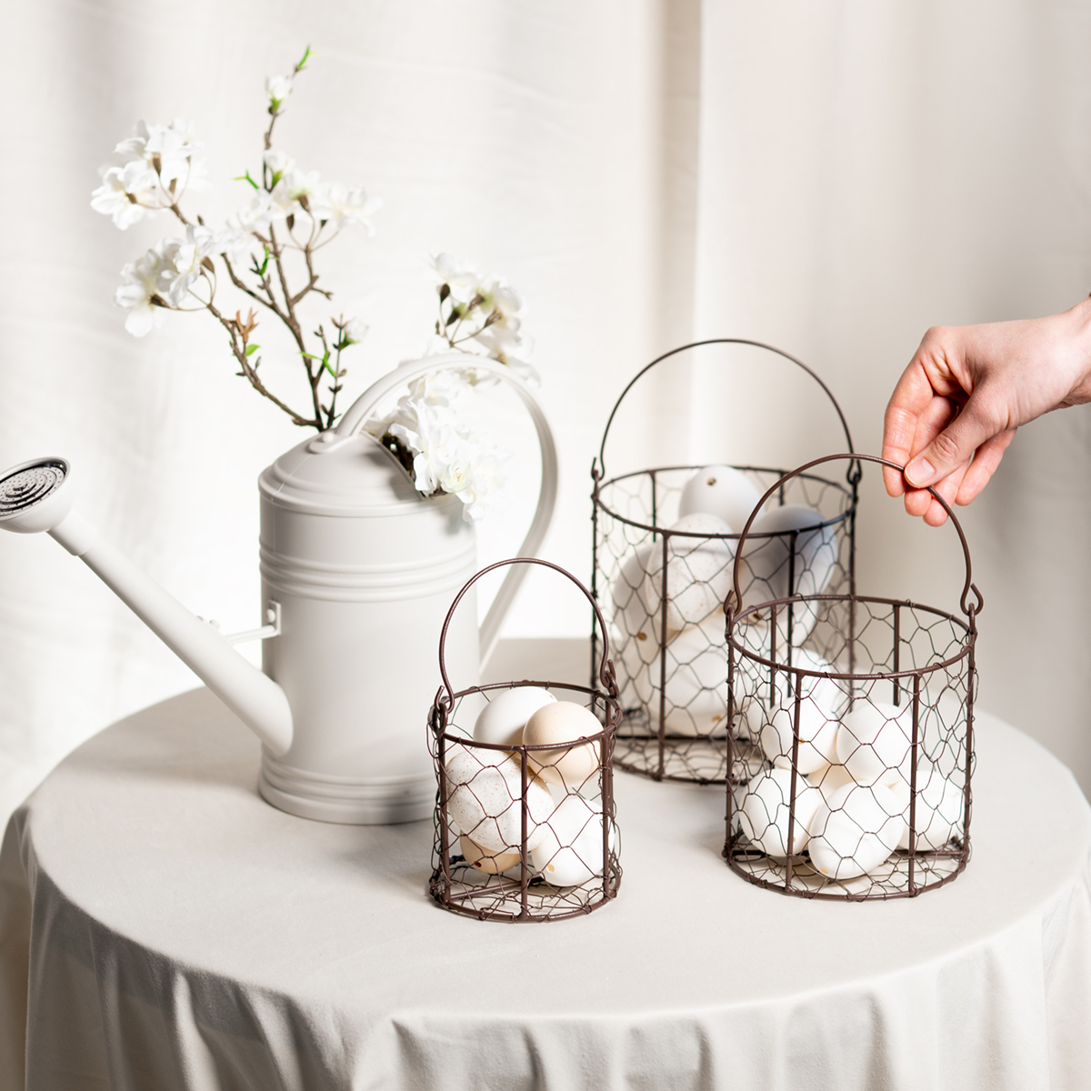 This set of three wire baskets is a winner all around. Made of sturdy metal and exceptionally durable thanks to their fine mesh, they are the perfect addition to any modern home. With a diameter of 15 cm (largest basket) and a height of 25 cm, plant arrangements and flowers truly shine in these baskets. Thanks to their round shape and sturdy handles, the baskets are easy to carry from room to room or into the garden. Anyone who loves vintage style will be instantly captivated. The brown color ensures that the set blends harmoniously into any décor – from Scandinavian minimalism to rustic country style. The baskets look particularly good when combined with other decorative elements made of natural materials. Why not give them a try?