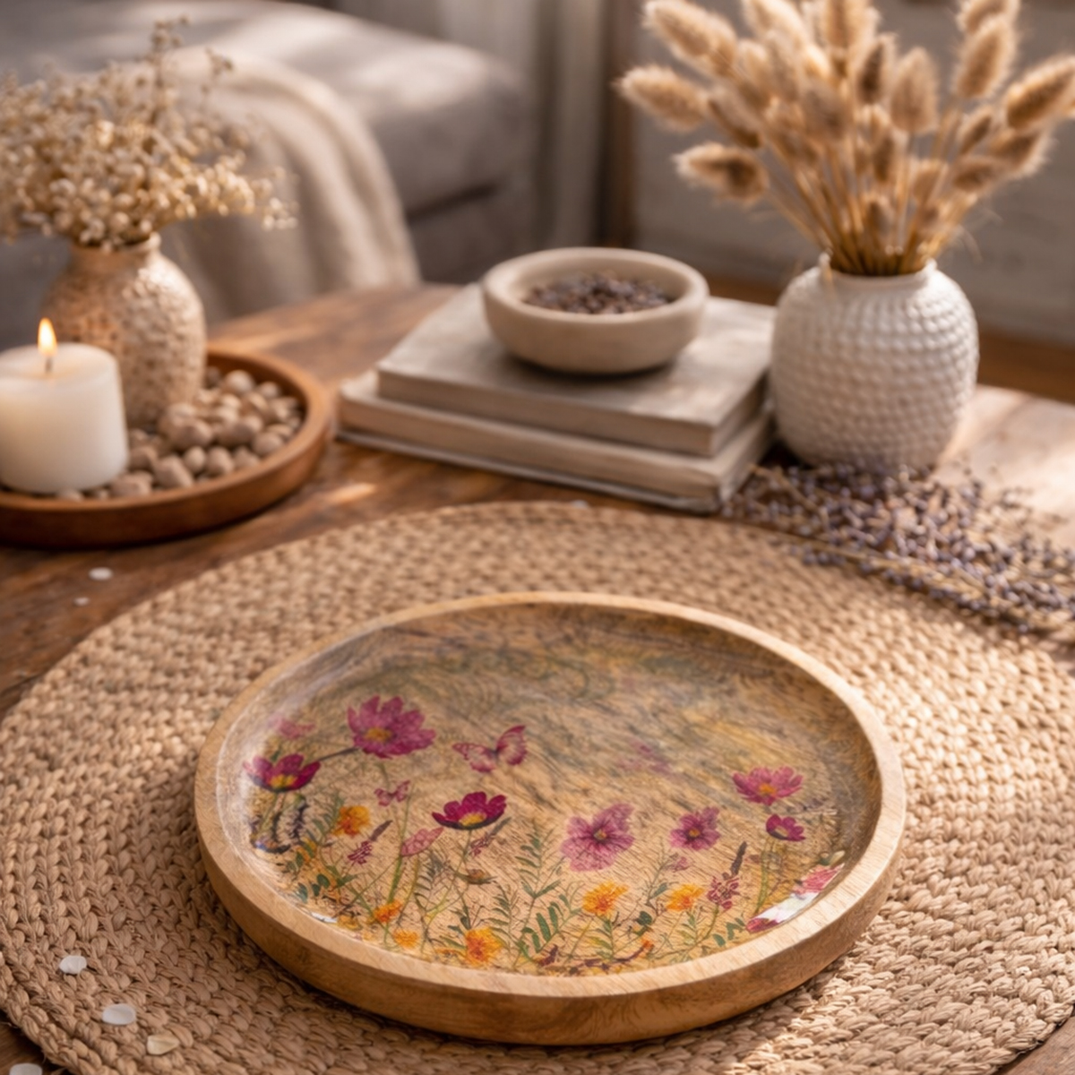 Experience the beauty of nature right on your table with our three wooden plates. Each wooden plate has a diameter of around 15 cm and features a magical flower and butterfly pattern in elegant pink. The natural wood structure is highlighted by a protective, transparent varnish layer that gives the plates a soft shimmer. Ideal as table decorations for spring and summer, these decorative plates add a romantic touch to a modern country house style or vintage decorations.