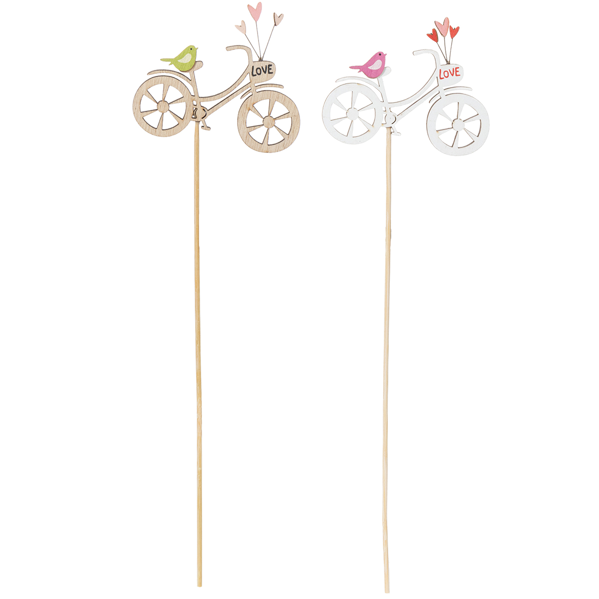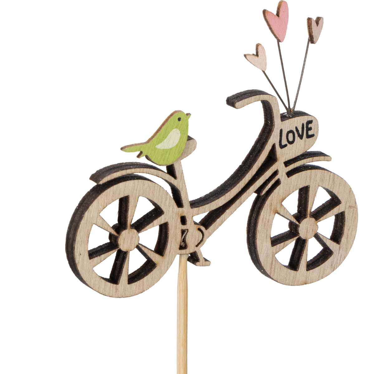 Looking for a special decoration to bring spring into your home? These wooden stakes with a bicycle motif are just the thing to add a romantic touch to your living room, balcony, or patio. With delicate details like a natural-colored wooden bicycle, small hearts, and charming little birds, this decoration is sure to catch everyone's eye. How about a creative arrangement in a fresh spring bouquet or as a highlight in a planter? The natural look of the stakes is a perfect match for country-style decor or modern floral arrangements.